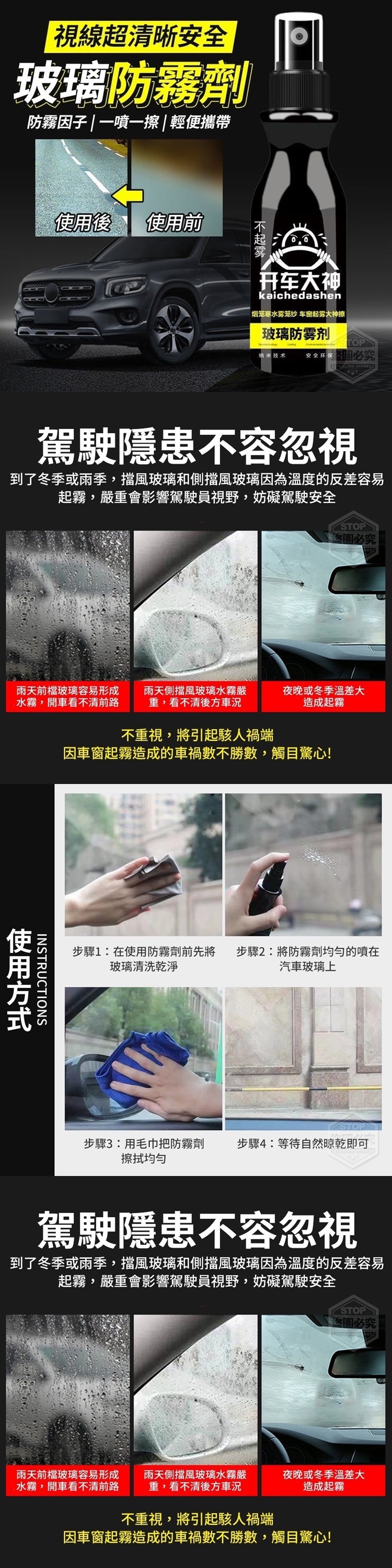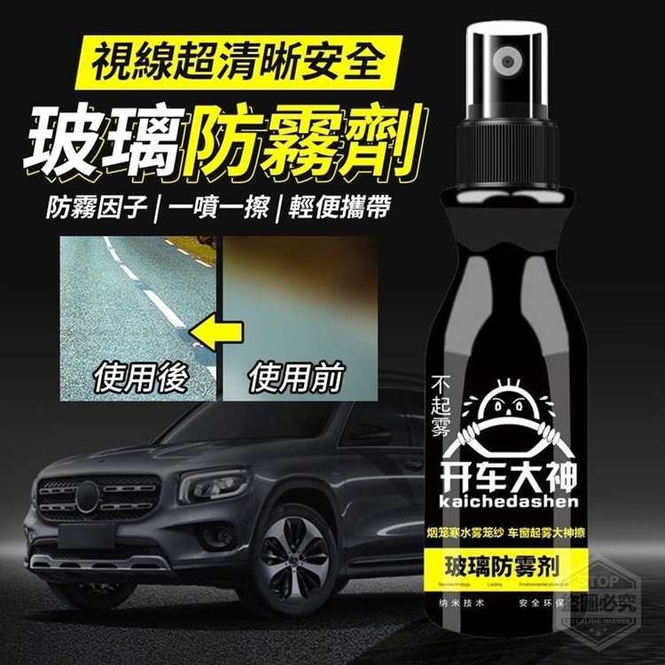 【商品說明】- 還在為視線受限而煩惱? 駕駛隱患不容忽視,到了冬季或雨季 擋風玻璃和側擋風玻璃 因為溫度的反差容易起霧 嚴重會影響駕駛員視野,妨礙駕駛安全 不重視,將引起駭人禍端 因車窗起霧造成的車禍數不勝數, 觸目驚心! 視線超清晰安全玻璃防霧劑 1噴1擦、不在起霧守護你的行車安全~ 廣泛適用 車居兩用,汽車擋風 玻璃、眼鏡、衛浴玻璃、安全帽 防霧因子 一噴一擦 輕便攜帶 影片僅供參考使用方式 所有配件以實際收到為主