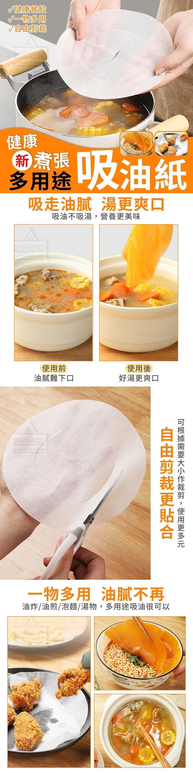 【商品尺寸】-20cm 【商品材質】-無紡布 【商品說明】- 你還在危害你的健康,攝入過多油脂嗎? 小心攝入過多油脂帶來的危機 身體肥胖 三高 身體不適 健康新煮張多用途吸油紙 帶你走進健康又美味的飲食生活 健康餐飲 有效吸油 有效吸附油脂,跟油膩說掰掰 吸走油膩 湯更爽口 吸油不吸湯,營養更美味 自由剪裁更貼合 可根據需要大小作裁剪,使用更多元 一物多用 油膩不再 油炸/油煎/泡麵/湯物 多用途吸油紙,健康新煮張 影片僅供參考使用方式 所有配件以實際收到為主
