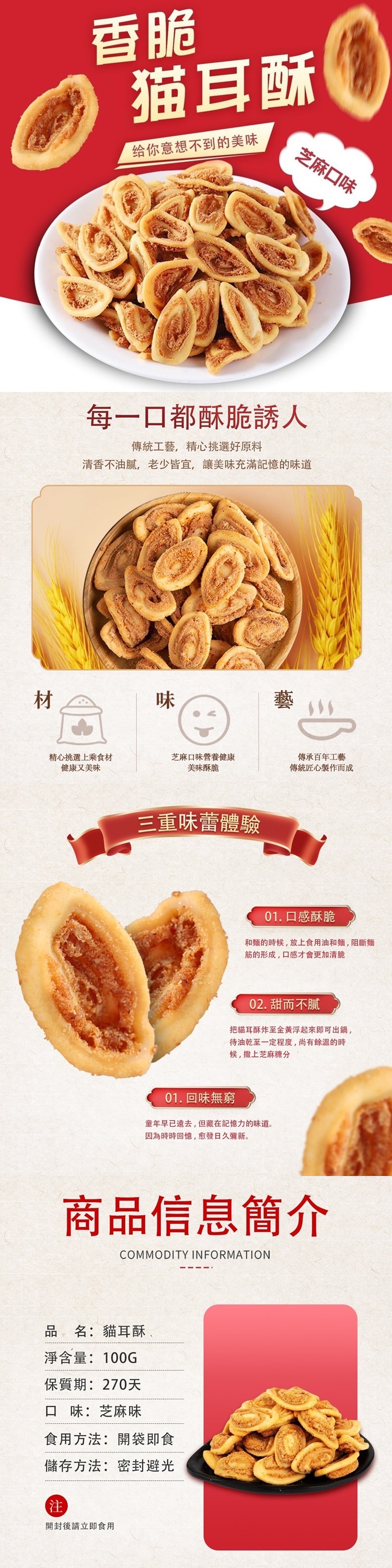 擄獲大、小朋友的心 兒時美味片片酥脆-貓耳酥 濃郁芝麻香搭配卡滋卡滋香氣在舌尖炸開 精心挑選好原料造就經典又健康的美好滋味 百年工藝傳統匠心製成,每一口都讓人懷念 愜意下午茶搭配香而不膩的貓耳酥靜享慢時光 【每袋重量】約100g 【保存期限】9個月(未開封) 【製造日期】2022/1 【製造日期】標示於包裝 【保存方法】置於陰涼乾燥處、避免陽光直射