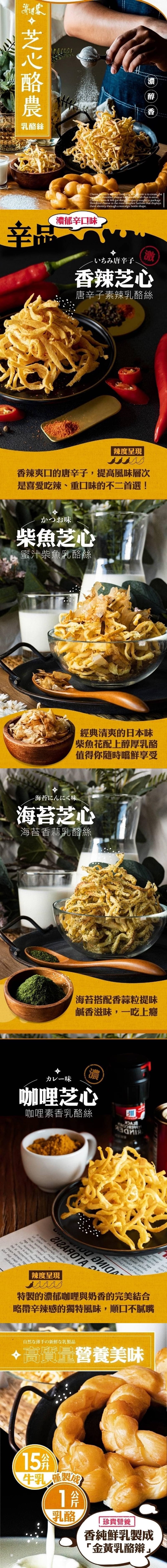 五種口味可任選 脆糖原味乳酪絲(蛋奶素) 咖哩素香乳酪絲(蛋奶素) 唐辛子素辣乳酪絲(蛋奶素) 海苔香蒜乳酪絲(奶蛋含五辛) 蜜汁柴魚乳酪絲(葷) 香濃芝心酪農乳酪絲, 15公升的牛乳只能製成1公斤的乳酪 採低溫烘焙 才能製成濃郁的香氣和酥脆口感 乳酪絲含有多種營養素, 比起液態的牛奶, 乳酪絲中的鈣質更易於忍提消化吸收~ 適合各年齡層食用, 給小朋友當零食吃也很棒喔! 內容量:100公克/包 保存期限:常溫6個月 原產地:台灣