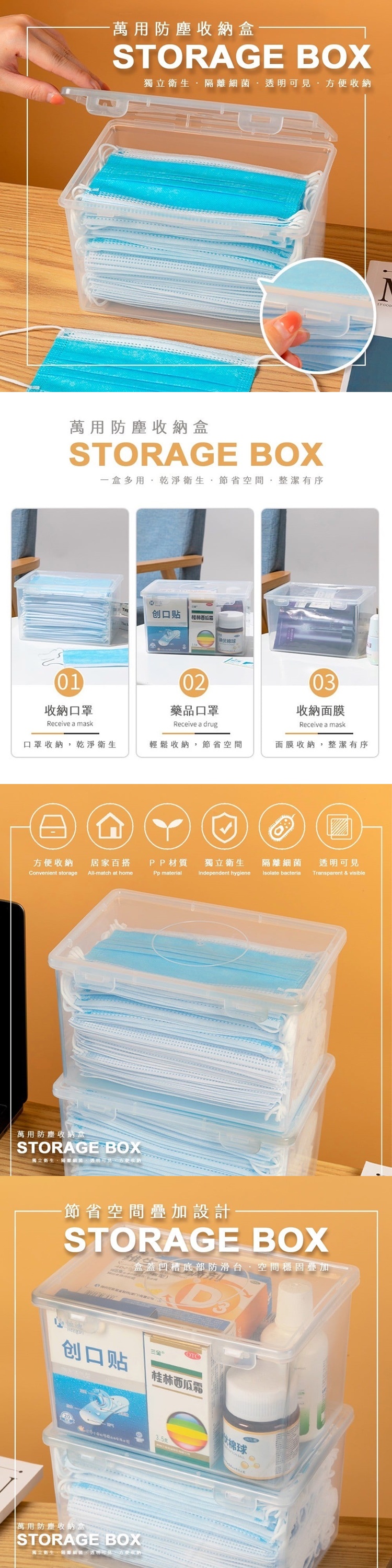不只可收納口罩 也可以當作急救箱,化妝盒,文具盒... 反正放在桌上會凌亂的 通通給它丟進去 防疫期間口罩是否也做好防護 散落在外的口罩還沒戴就沾染灰塵細菌受潮 沒有固定收納位置還會忘記放的位置找不到 使用萬用防塵收納盒 讓還未使用過的口罩維持潔淨 一個可收納到70個口罩左右 獨立衛生 隔離細菌 容量加大 萬用收納 疊放設計 節省空間 透明可見 PP材質 方便收納 居家百搭 材質:PP 功能:防水、防塵 尺寸:長21.3cm 寬14.7cm 高12.7cm