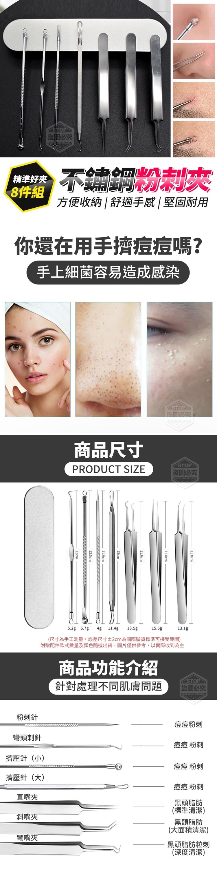 【商品尺寸】擠壓針(小)12.5cm、擠壓針(大)13cm、粉刺針11.9cm、彎頭刺針、12cm直嘴夾11.8cm、斜嘴夾11.8cm、彎嘴夾11.6cm(尺寸為手工測量,誤差尺寸±2cm為國際驗貨標準可接受範圍)【商品說明】-