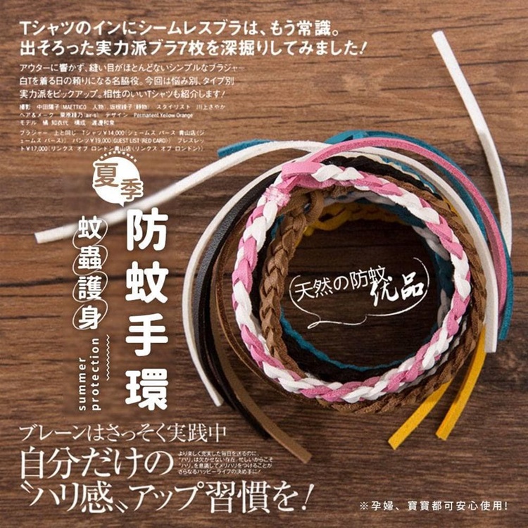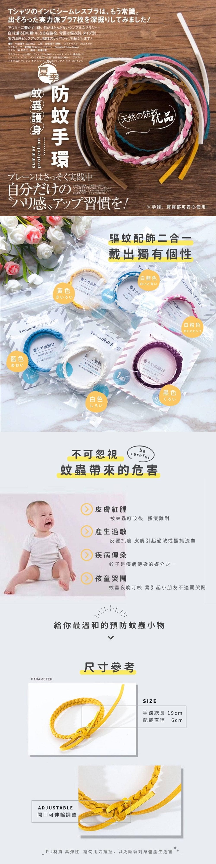 可以做配件的驅蚊手環 誰戴都好看,為裝扮加點分 使用100%天然精油的驅蚊手環, 不含殺蟲成分,安全無副作用。 成分是從香茅以及薄荷中提取純植物精油, 帶有一股另人安心的精油味, 利用它們自然植物的清香達到驅蚊的效果。 孕婦以及寶寶都可以放心使用 驅蚊手環開口可以調節長短, 最短12cm,最19.5cm。 大小可調節,大人小孩都合適, 也可以綁在包包上、寶寶推車...等 材質:定制特柔人造皮 味道:天然植物精油味 顏色:粉白、藍白、黑、白、 黃、咖啡、藍 (隨機)