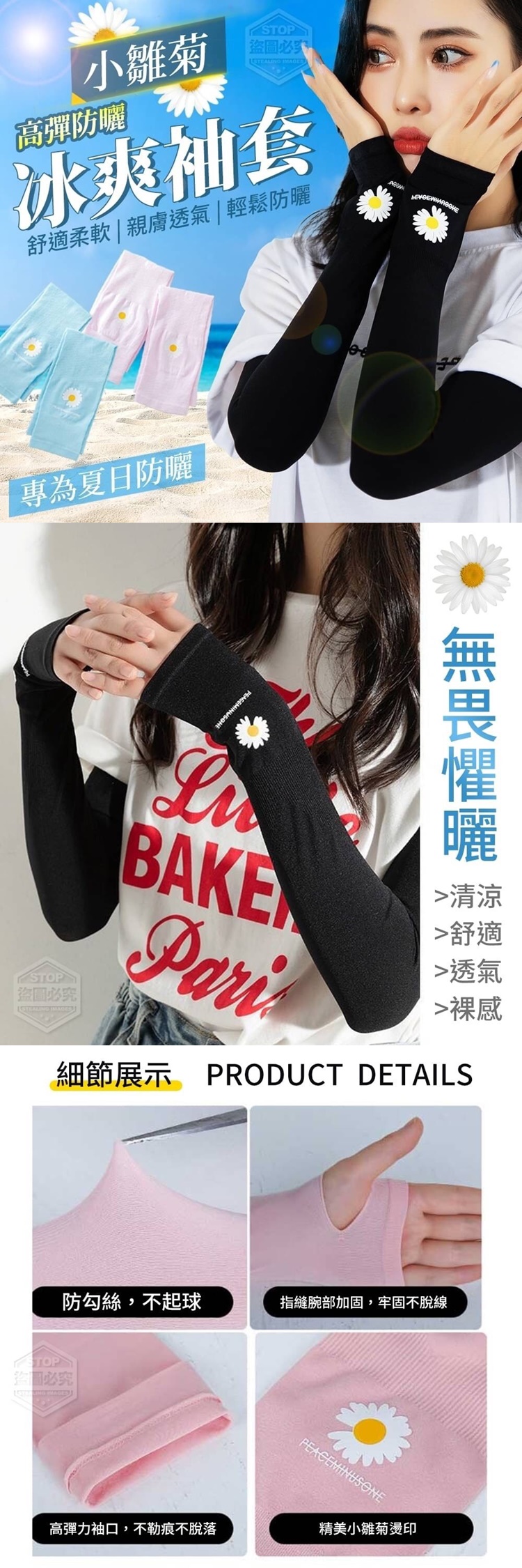 顏色:黑 、藍 、粉 【商品說明】- 潮流趨勢小雛菊高彈防曬冰爽袖套, 採用上等透氣材質吸汗、 舒適、透薄、冰涼透氣 手指開口設計可以更大面積的保護手臂 輕鬆遮擋紫外線,保護肌膚、冰爽觸感 專為防曬而生,讓你無懼夏日炎熱太陽! 給您一個冰爽的夏天~ ✓舒適柔軟 ✓親膚透氣 ✓輕鬆防曬 高彈力不緊繃、牢固不勾絲,抗起球 可以拉伸至2倍長,男女均可佩戴! 清涼糖果色設計, 時尚好看更好搭配每款衣物~ 【雛菊的花語:天真和諧 希望純潔幸福純真的美以及藏在心底的愛】