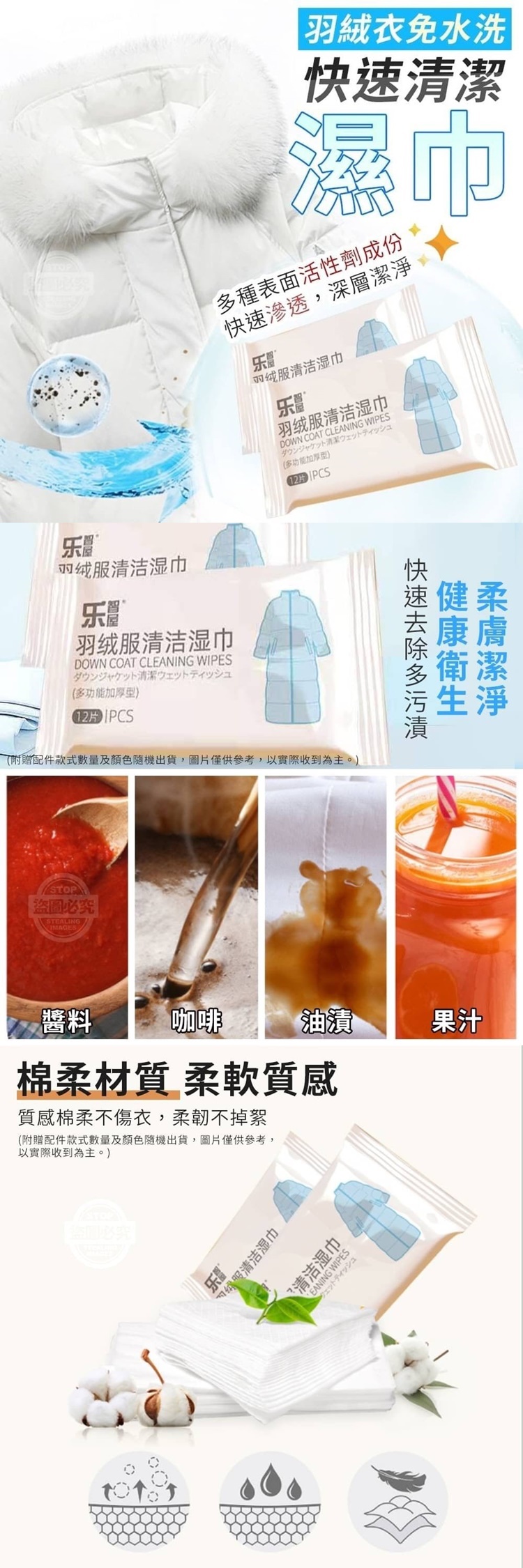 一包12抽 【商品說明】- 外出在外不小心把衣服弄髒了 別擔心~ 羽絨衣免水洗快速清潔濕巾 擁有多種表面活性劑成份 快速滲透各種污漬 醬料、咖啡、油漬、果汁 等各種污漬都能清除 立即擦去,還你衣服本色 無需水洗,免除繁鎖的洗衣程序 輕輕一擦,各種污漬就能清潔乾淨 在外也能避免各種尷尬污漬的問題