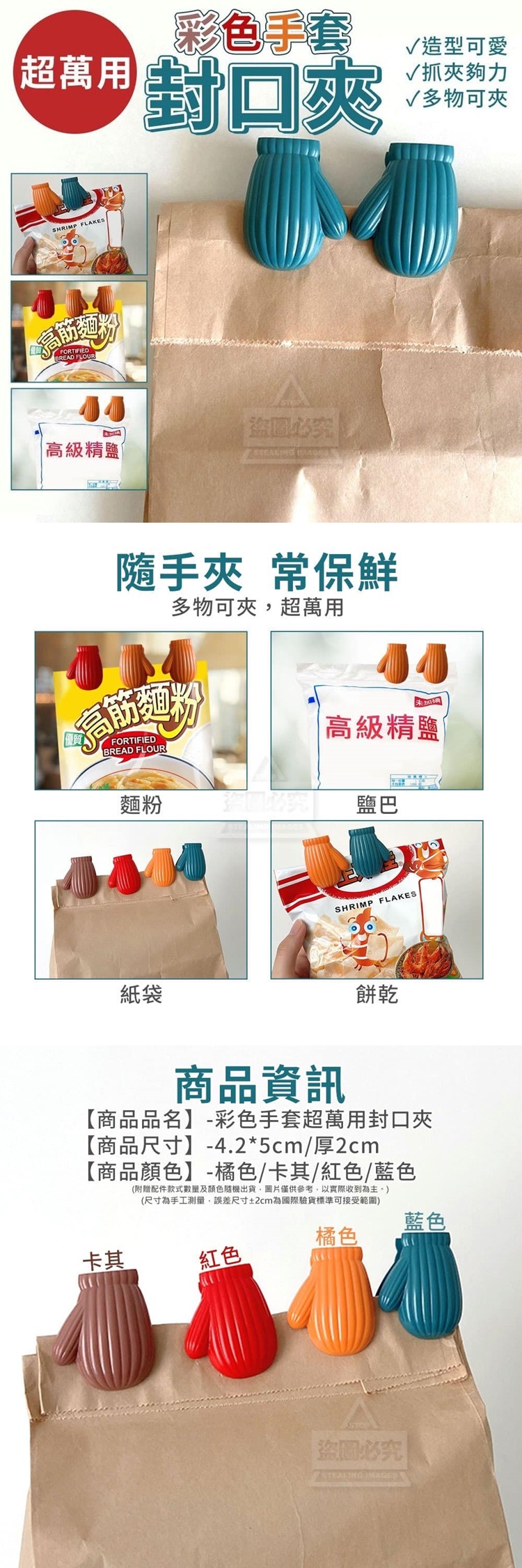 【商品尺寸】-4.2*5cm/厚2cm 【商品顏色】-橘色/卡其/紅色/藍色 (尺寸為手工測量, 誤差尺寸±2cm為國際驗貨標準可接受範圍) (附贈配件款式數量及顏色隨機出貨, 圖片僅供參考,以實際收到為主。) 【商品說明】- 誰說封口夾不可以很‧可‧愛 彩色手套超萬用封口夾 手套造型封口夾,輕鬆封口 你廚房的得利小法寶 抓夾夠力 有效封口 內置彈簧控穩固抓夾,輕鬆一夾秒封口 手套造型 萌趣可愛 各色手套,童趣可愛,還可當分類夾 隨手夾 常保鮮 麵粉/鹽巴/紙袋/餅乾 多物可夾,超萬用