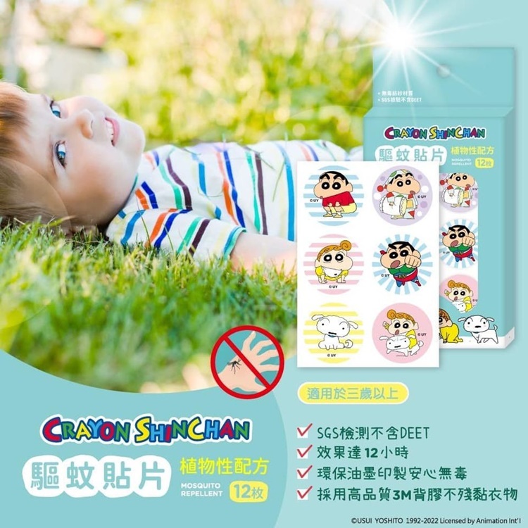 【商品規格】- 12枚 【商品說明】- 夏日到來蚊蟲蠢蠢欲動 小鮮肉 要小心了 超可愛的小新造型驅蚊貼~ 一定是小朋友的最愛 也讓大人小孩都愛不釋手 日常必備驅蚊貼 保護每個人的肌膚 一貼即可,輕鬆遠離蚊蟲 愛貼哪就貼哪 貼衣服 貼褲子 貼推車 蚊蟲不會來咬我啦 植物性萃取安心防護 香茅精油+尤加利精油 香氣濃郁又提神 3M背膠,好貼不殘膠 環保油墨印製安心無毒 SGS檢測不含DEET 效果長達12小時 外出郊遊學校上課 公司上班 戶外運動 小包裝隨身攜帶 去哪裡都可以使用,再也不怕蚊蟲干擾