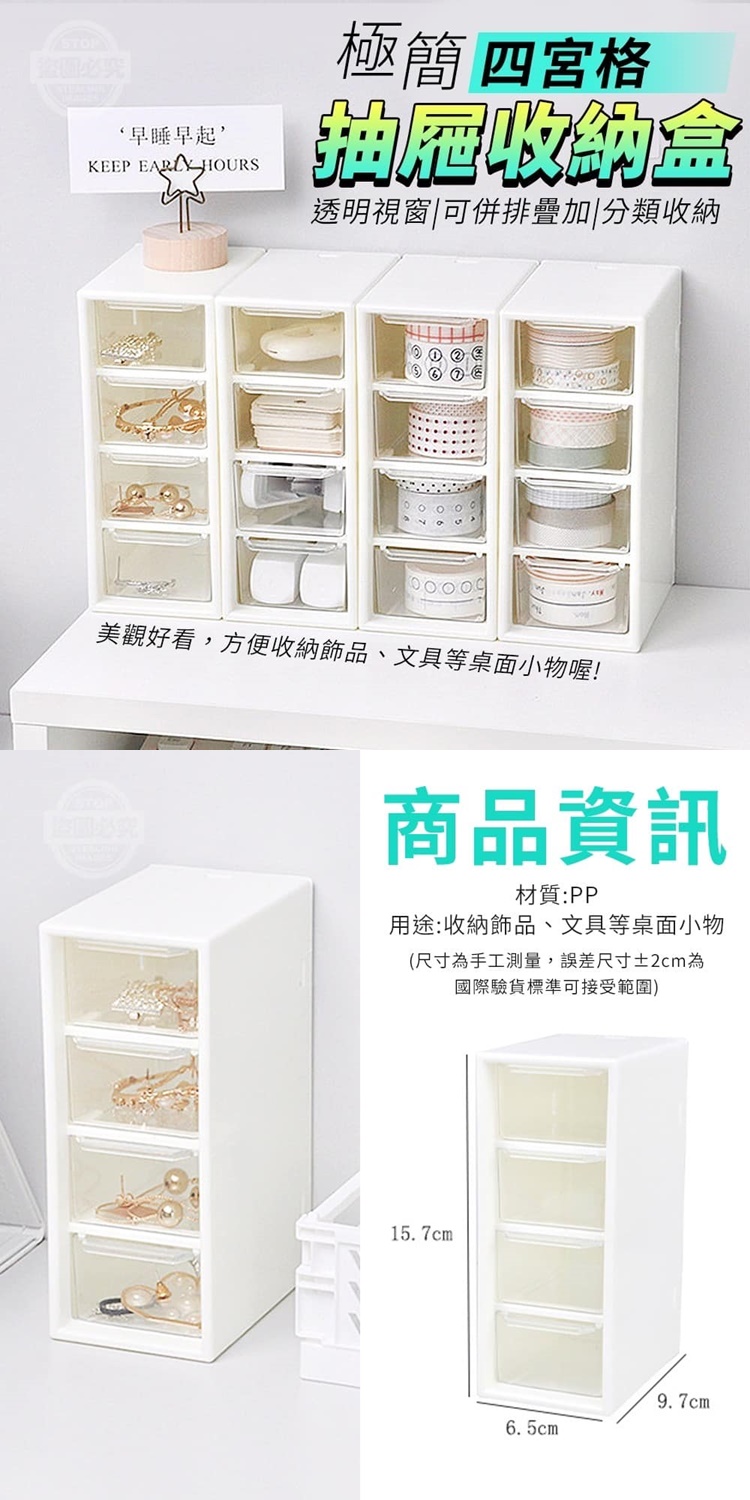 【商品材質】-PP 【商品尺寸】-6.5x9.7x15.7cm (尺寸為手工測量, 誤差尺寸±2cm為國際驗貨標準可接受範圍) 【商品說明】- 極簡就是美~ 四宮格抽屜收納盒 設計簡約,沒有過多複雜的設計 可收納飾品、文具等桌面小物 美觀好看,讓桌面保持清爽整潔 透明視窗設計 內置物品清晰可見 方便你找尋你要的物品 併排疊加 可併排或或疊加使用 收納桌面小物 獨立小抽屜設計 四個小抽屜,方便拉開拿取 分開放置分類收納飾品 喜愛極簡風格的你 這款收納小物絕對要入手