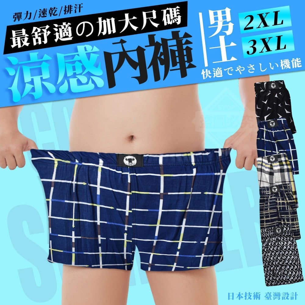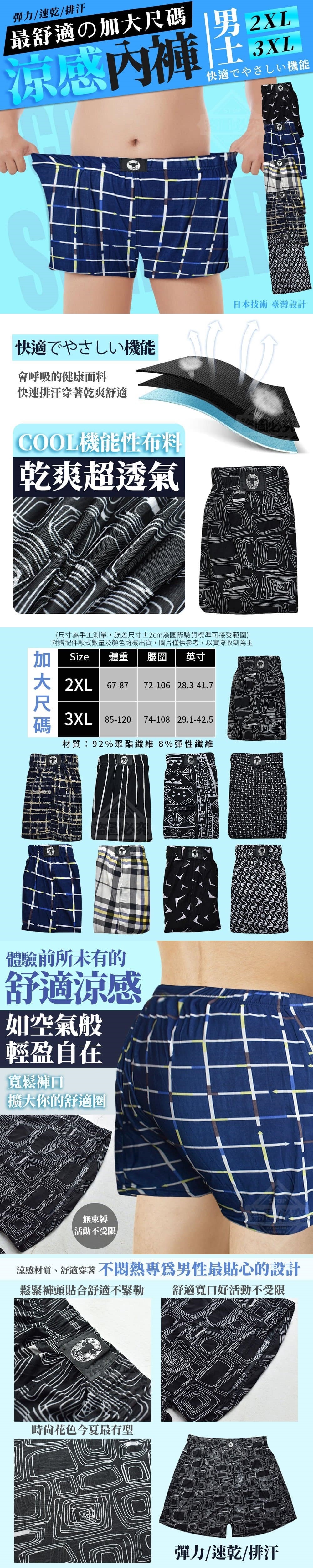 【商品規格】-2XL/3XL【商品款式】-花色隨機【商品說明】-最近大家瘋狂暴動敲碗有沒有!加大尺碼!終於讓我洽談成功了!千萬要好好把握適合多種體型涼感內褲讓您活動時更舒適更自在時尚與機能兼具COOL涼感透氣機能性布料超級好穿超舒適超沁涼吸濕排汗 高彈輕薄超涼爽、不悶熱!自然就不會有異味產生全方位的保護男人健康與舒適度專為男性最貼心的設計讓你輕鬆舒適無負擔一整天完全不會有緊繃的感覺快適でやさしい機能透氣排汗 100%涼感 舒適肌感彈力/速乾/排汗日本技術台灣設計會呼吸的健康面料快速排汗穿著乾爽舒適