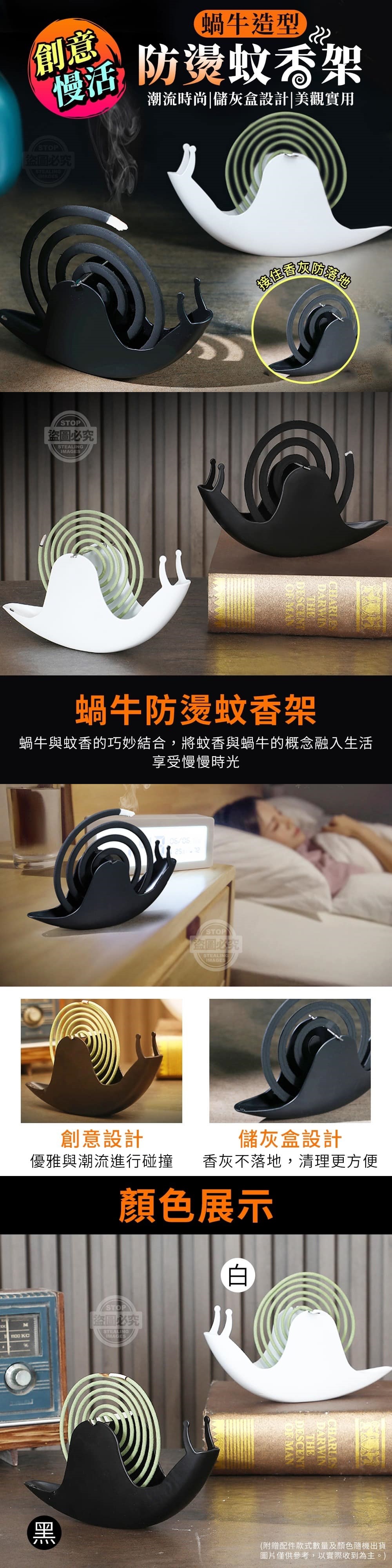 A 創意慢活蝸牛防燙蚊香架 顏色隨機 【商品顏色】-黑、白 (附贈配件款式數量及顏色隨機出貨,圖片僅供參考,以實際收到為主。) 【商品說明】- 快步調的生活讓人喘不過氣來 創意慢活蝸牛防燙蚊香架 優雅與潮流進行碰撞 蝸牛與蚊香的巧妙結合 將蚊香與蝸牛的概念融入生活 讓你享受慢慢時光 放上蚊香或檀香 煙往上慢慢縹緲的情境 享受慢慢閑靜無蚊打擾的氛圍 蝸牛彎曲的身體可用來接住香灰 防火接灰不落地,避免燙壞地板 清理更是方便 影片僅供參考使用方式 所有配件以實際收到為主