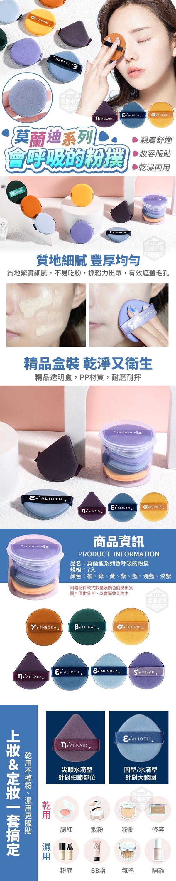 【商品顏色】-橘、綠、黃、紫、藍、淺藍、淡紫附贈配件款式數量及顏色隨機出貨,圖片僅供參考,以實際收到為主。【商品說明】-莫蘭迪系列會呼吸的粉撲上妝&定妝一套搞定乾濕兩用、妝感自然乾用不掉粉、濕用更服貼鎖住你的輕透奶油肌