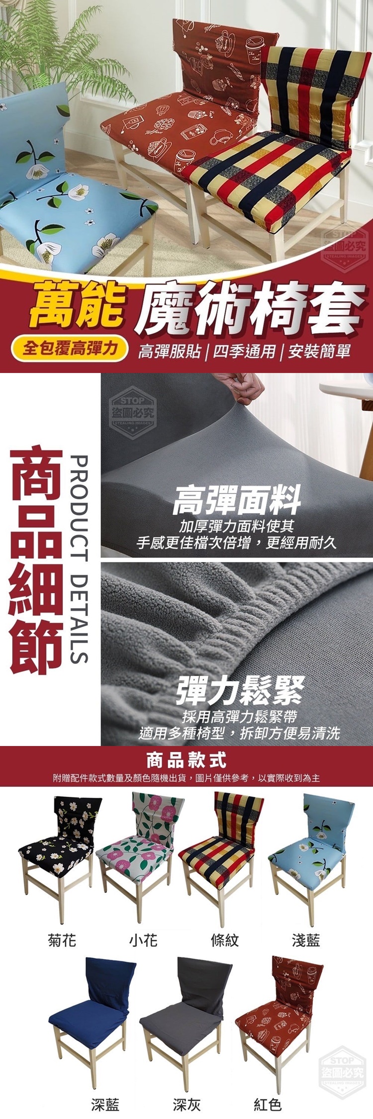 【商品顏色】-菊花、小花、條紋、淺藍、 深藍、深灰、紅色 (附贈配件款式數量及顏色隨機出貨, 圖片僅供參考,以實際收到為主。) 【商品說明】- 全包覆高彈力萬能魔術椅套 全包設計、防塵更全面,柔 軟親膚透氣,高彈面料,加 厚彈力面料使其手感更佳! 檔次倍增,更經用耐久~~ 採用高彈力鬆緊帶,適用多 種椅型,拆卸方便易清洗, 潔淨舒適,打造溫馨舒適的 家居環境~ 高彈服貼 四季通用 安裝簡單