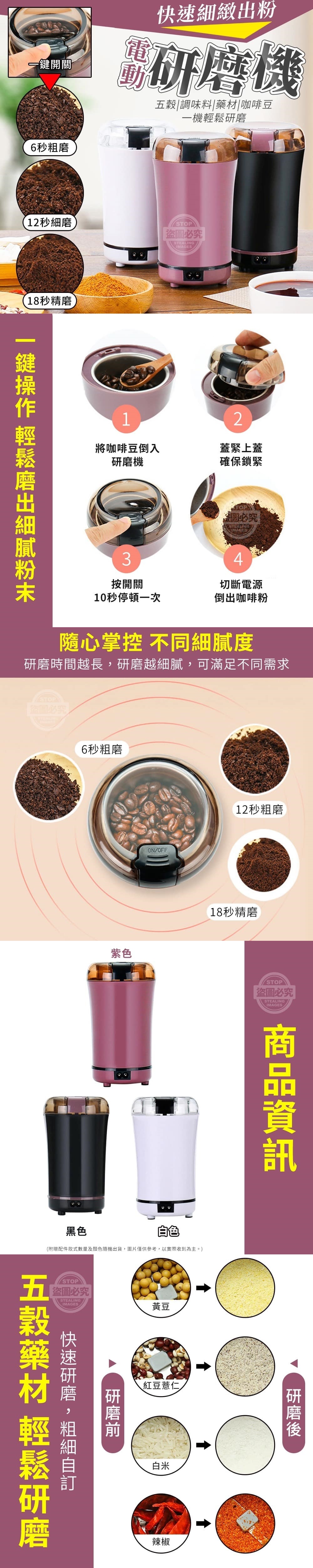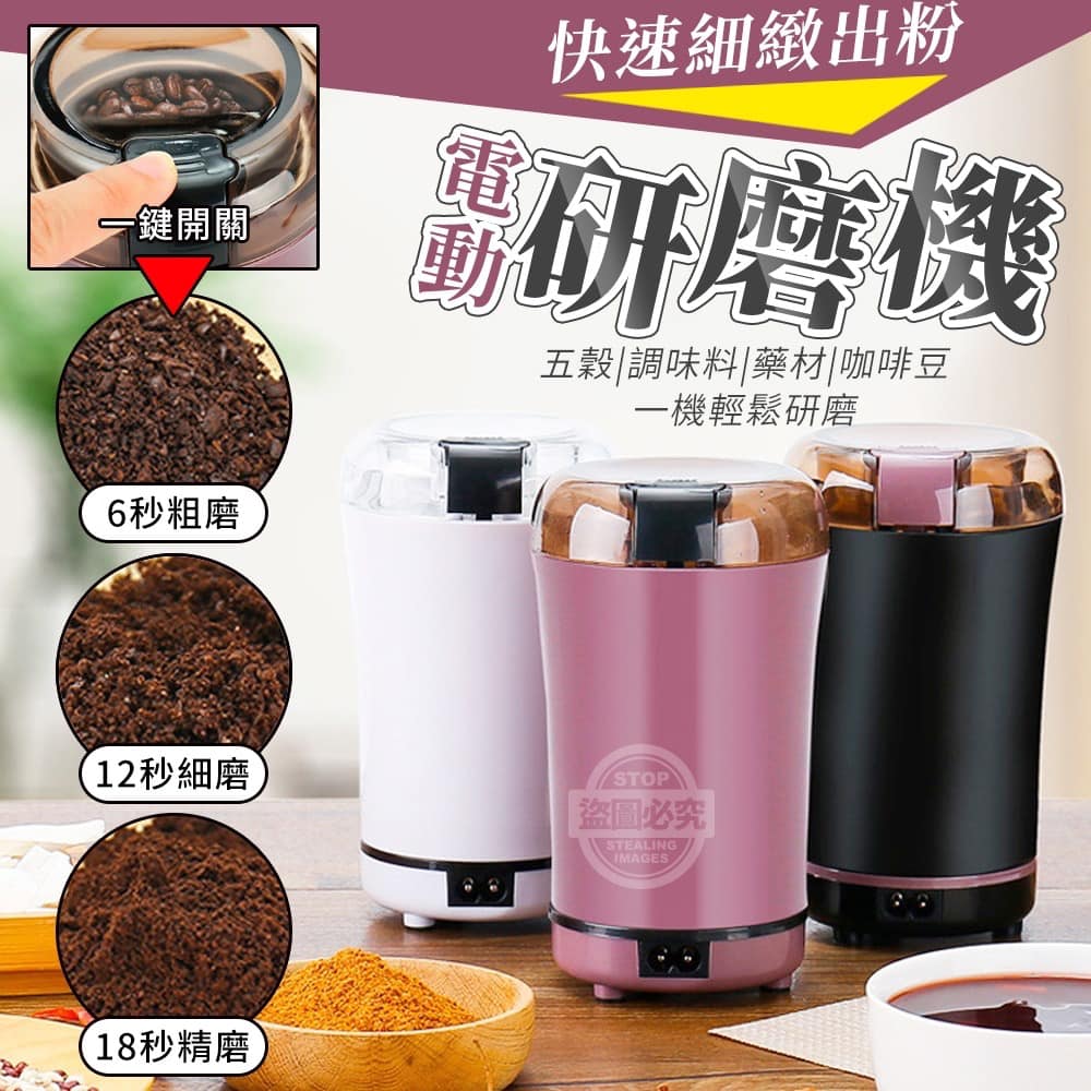 【商品顏色】-紫、黑、白(附贈配件款式數量及顏色隨機出貨,圖片僅供參考,以實際收到為主。)【商品說明】-磨豆不求人!就用這款快速細緻出粉電動研磨機!一鍵操作 輕鬆磨出細膩粉末1.將咖啡豆倒入研磨機2.蓋緊上蓋確保鎖緊3.按開關10秒停頓一次4.就可研磨出細膩的粉末喔!研磨時間越長,研磨越細膩6秒粗磨、12秒細磨、18秒精磨可滿足不同需求透明保護蓋透明可視,可看到研磨狀況黃豆、紅豆薏仁、白米淮山片、辣椒等五穀中藥材都輕鬆研磨是您的居家研磨神助手!!影片僅供參考使用方式所有配件以實際收到為主