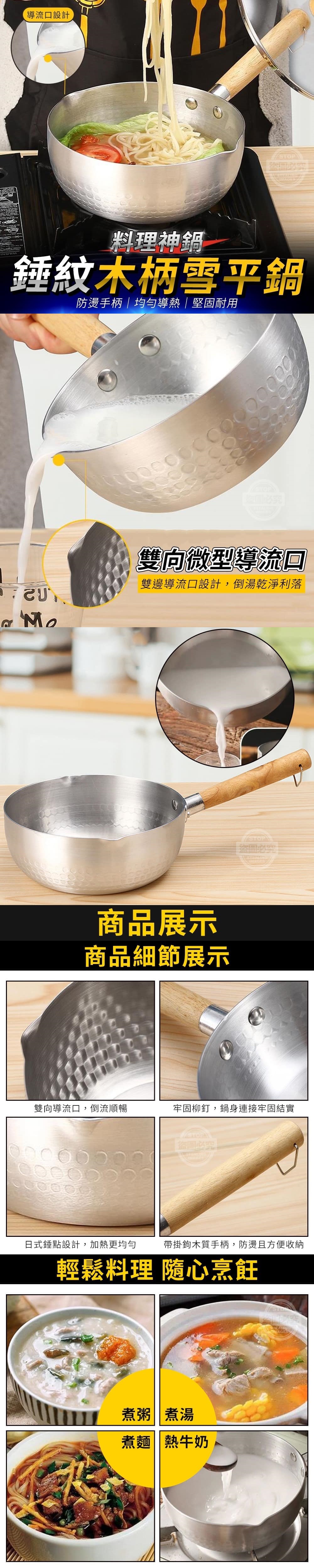 【商品材質】-410不鏽鋼【商品尺寸】-鍋直徑18cm、總長35cm(尺寸為手工測量,誤差尺寸±2cm為國際驗貨標準可接受範圍)【商品說明】-熱騰騰又美味的泡麵煮好啦!你要拿夾子或手套端出去還要另外準備飯來盛裝乾麻這麼麻煩料理神鍋錘紋木柄雪平鍋可拿來拿來煮麵、煮湯煮粥、熱牛奶等各種料理煮好的美味料理直接拿著把手就可端出去準備好筷子,開始享用日式錘點設計有效縮短沸騰時間加熱更均勻雙向微型導流口雙邊導流口設計倒流順暢 且乾淨利落不怕延邊流出弄得髒兮兮牢固柳釘鍋身連接牢固結實經久又耐用木質手柄,防燙好拿取且帶掛鉤,方便懸掛收納好晾乾一鍋多用輕鬆烹煮各式料理隨心烹飪,盡享美味影片僅供參考使用方式所有配件以實際收到為主