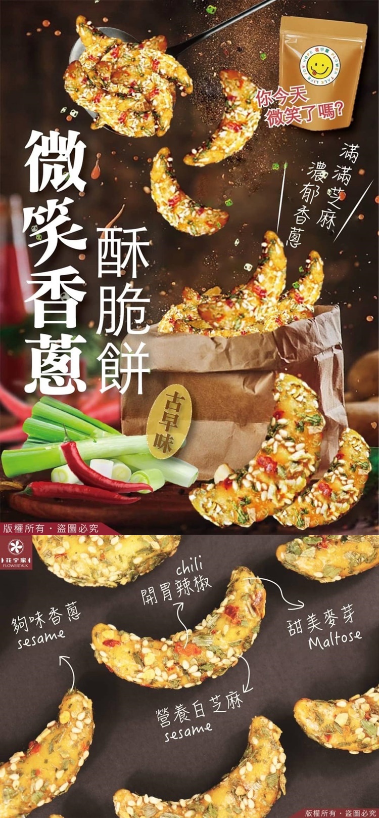 花宇家的產品,真的都超好吃,這個甜鹹蔥香滿溢的年味微笑餅乾,大家趕快團起來,一路吃到過年,送禮的微笑包裝,讓人會心一笑。每片微笑餅上都是滿滿的蔥,芝麻、濃郁的麥芽味,酥脆的口感,聞了就快流口水了!但搭配辣椒提味不辣喔,吃起來就是連續的香~這種酥麻的口感,讓人欲罷不能!下午茶時間拿出來,馬上被掃空!直接團20包起來,送禮也超有面子。復古美食,看似簡單但卻不簡單的微笑餅,