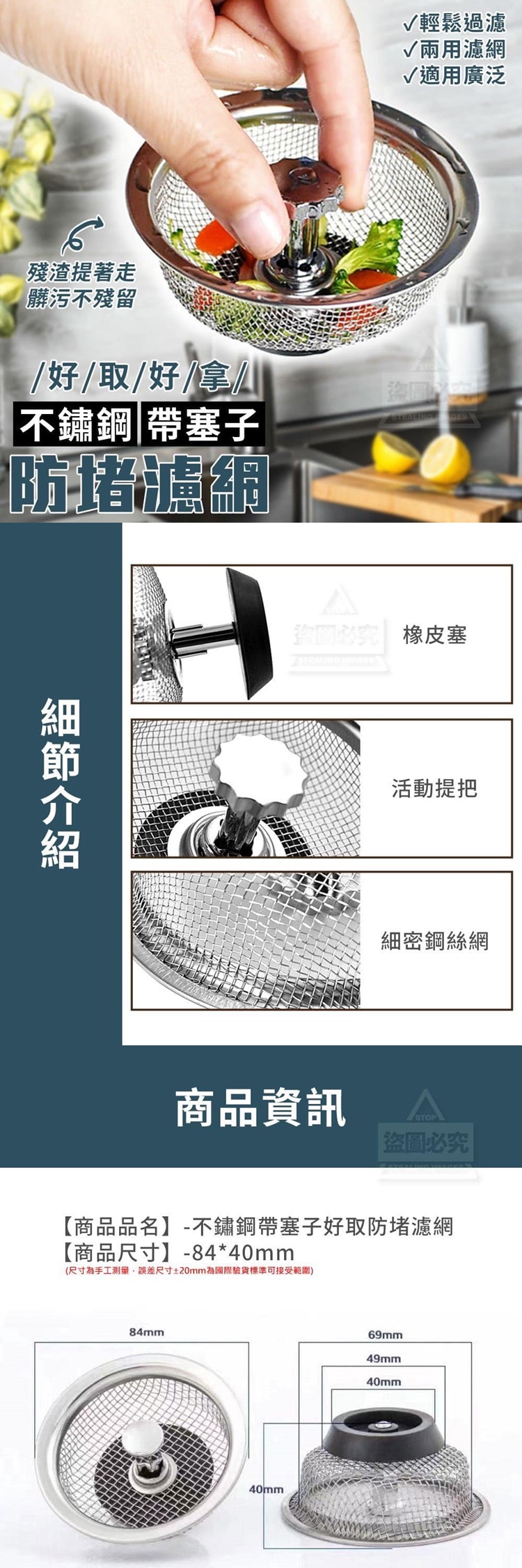 【商品尺寸】-84*40mm (尺寸為手工測量, 誤差尺寸±20mm為國際驗貨標準可接受範圍) 【商品說明】- 菜渣、頭髮,卡卡卡、塞塞塞 一些有的沒的殘渣垃圾還卡在排水口 正煩惱不已嗎? 不鏽鋼防堵濾網 不僅能有效過濾殘渣 更能是塞子,讓儲水變得更便利 儲水隔渣兩用 水槽可過濾、儲水,乾淨省心 輕鬆過濾 沒煩惱 輕鬆過濾瓜果蔬菜的殘渣,讓收拾更簡單 適用範圍廣泛 洗手台/浴室/廚房 簡單過濾殘渣,讓清潔變得更省心省力 影片僅供參考使用方式 所有配件以實際收到為主