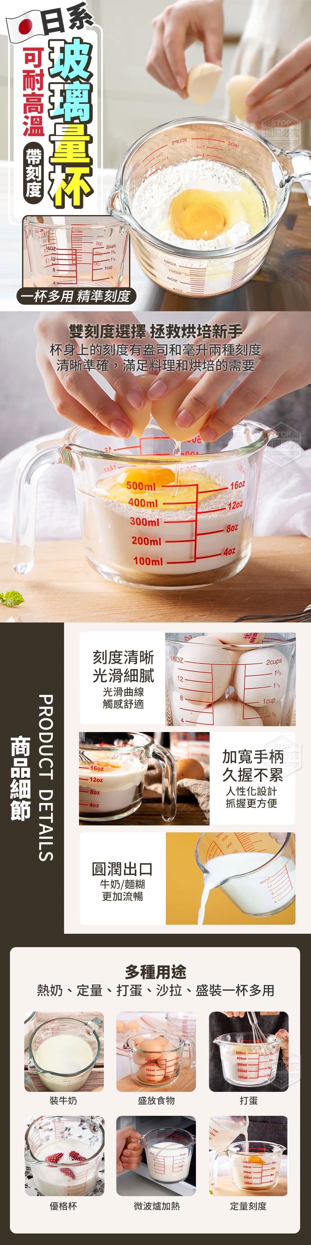 【商品材質】-玻璃【商品容量】-500ml【商品尺寸】-17*9cm尺寸為手工測量,誤差尺寸±2cm為國際驗貨標準可接受範圍【商品包裝】-盒裝【商品說明】-•簡單控制用量•解決手忙腳亂的烘培時光玻璃透亮、質感極佳烘焙計量醬汁調配都好用高透明度一目了然非常適合烘焙各種冷熱的需求「日系可耐高溫帶刻度玻璃量杯」讓烹飪變得更加輕鬆和準確刻度有盎司和毫升兩種刻度拯救烘培新手,清晰明確的刻度幫助您精確地測量所需的液體或固體材料從而保證食物的準確配方讓您的料理更加美味多種用途裝牛奶、涼水、打蛋、沙拉、盛湯一杯多用