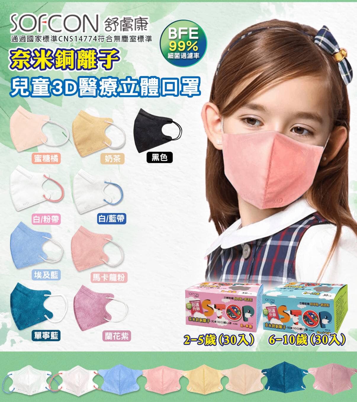 尺寸:幼幼/兒童 顏色:蜜糖橘,白/粉帶,白/藍帶, 埃及藍,單寧藍,奶茶,馬卡龍粉,蘭花紫,黑色 開學了,寶貝們的口罩準備好了嗎? 這次開團的是舒膚康奈米鋅銅離子 3D立體幼幼/兒童口罩,3D立體大空間, 不悶熱,最適合在現在這種炎熱天氣配戴, 彈性耳帶不緊繃不易斷, 最重要的是添加了奈米鋅銅離子, 除了能隔絕細菌外,更能主動抑菌, 給寶貝們雙重保護更安心