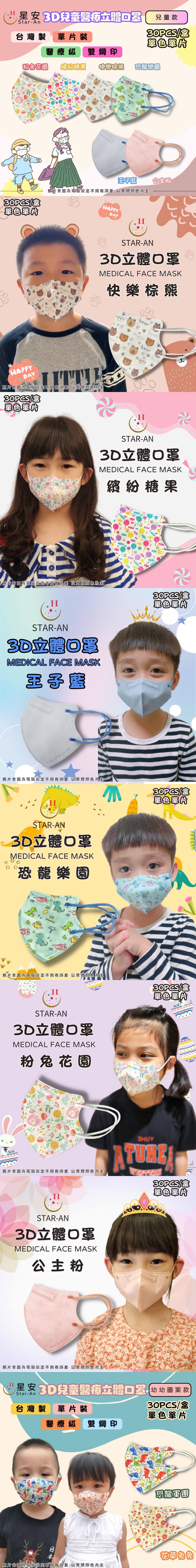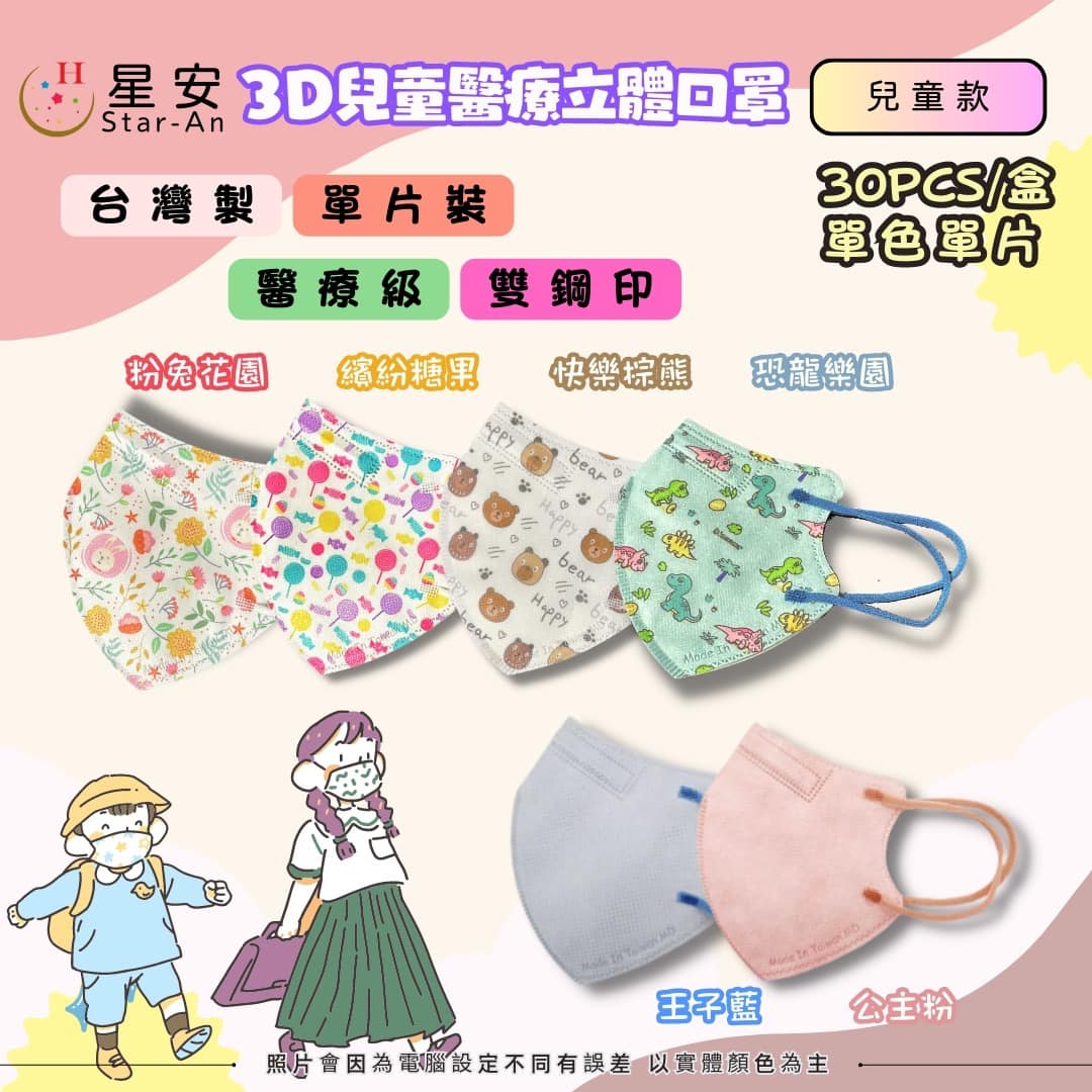 大家敲破碗 一直在詢問的兒童口罩 星安正式開賣囉~~雖然解封 但是還是有其他病毒 身為家長的我們還是會害怕呀而且要讓小孩戴口罩真的很困惱星安 兒童/幼幼 3D口罩 讓小朋友戴了口罩一樣透氣30入單片包裝搭配星安耳帶,不僅小小孩不咬耳朵 ,大朋友戴一整天耳朵也不會痛痛目前有熊熊 兔兔 恐龍 圖案可以選擇唷~U型包覆設計 讓您更好呼吸醫療級口罩 細菌過濾效率>99%高彈性耳帶,延展性佳,耳朵好舒服使用親膚性材質,讓您皮膚好呼吸立體大空間,包覆性佳長時間配戴舒適不悶熱MIT鋼印,台灣製醫療級口罩尺寸表:幼幼:9.9*10.2±0.5cm 建議1-4歲兒童:10.0*11.6±0.5cm 建議3-10歲