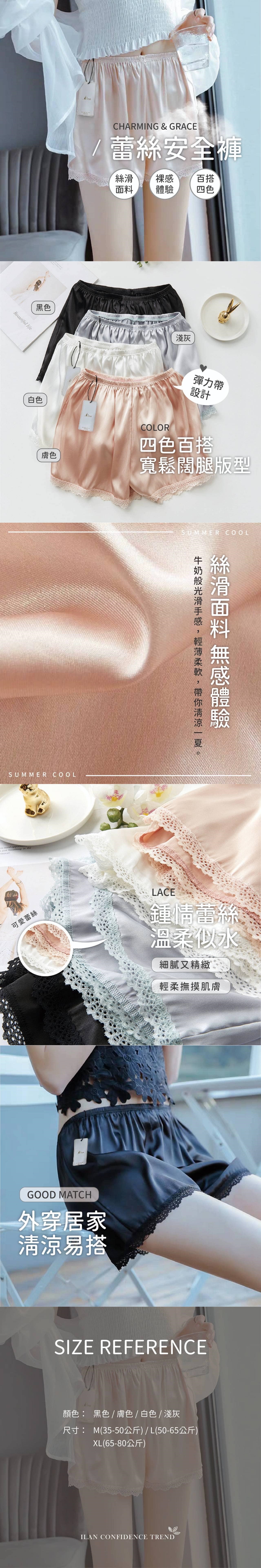 質量精選 絲綢蕾絲安全褲 顏色: 黑色 / 白色 / 粉色 / 灰色 尺寸: M / L / XL 夏天最親膚的居家褲 也可以當安全褲,防走光! 實體銷售質量款 不是洗沒兩次就會破掉的那種材質 對比過就會知道,差很大 選自進口仿絲綢面料 穿比不穿還舒服 真的很親膚柔軟舒適 嚴禁粗糙不透氣布料 我們只給CP值最高的品質 絲綢絲滑面料 冰涼裸感體驗 柔情四色任選 完美版型,尺寸可選 包裝: 精美袋裝