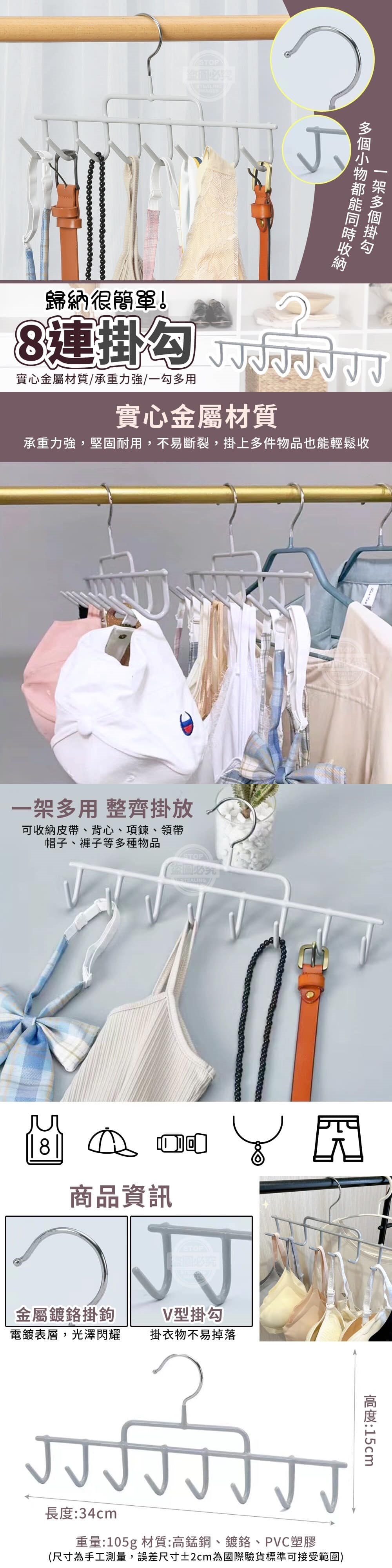 顏色隨機【商品材質】-高錳鋼、鍍鉻、PVC塑膠【商品尺寸】-34x15cm(尺寸為手工測量,誤差尺寸±2cm為國際驗貨標準可接受範圍)【商品顏色】-灰、白【商品說明】-一個來架只能掛一件衣物掛幾件就佔滿衣櫃空間這個掛架比一般衣架還要勵害歸納很簡單收納8連掛勾一架多個掛勾多個小物都能同時收納實心金屬材質承重力強,堅固耐用,不易斷裂就算一次掛上8件褲子也能輕鬆收納陽檯晾衣、衣櫃使用隨處可掛不佔空間東西都能整齊掛好金屬鍍鉻掛鉤電鍍表層,光滑毛邊金屬光澤閃亮質感好V型掛勾掛衣物不易掉落保護衣物不起包一架多用 整齊掛放可收納皮帶、背心、項鍊、領帶帽子、褲子等多種物品影片僅供參考使用方式所有配件以實際收到為主