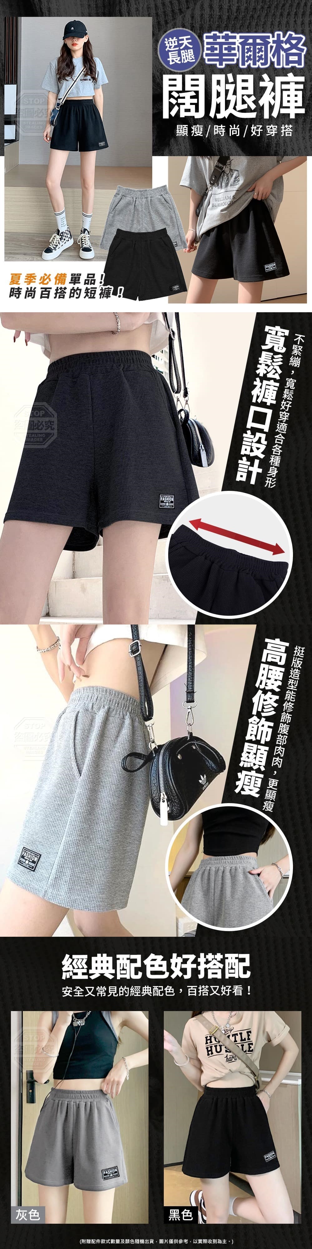 2色 :黑色、灰色(缺色隨機可穿到70kg【商品顏色】-黑色、灰色(附贈配件款式數量及顏色隨機出貨,圖片僅供參考,以實際收到為主。)【商品尺寸】-腰圍68cm、臀圍112cm、褲長36cm(尺寸為手工測量,誤差尺寸±2cm為國際驗貨標準可接受範圍)【商品材質】-華夫格【商品說明】-又到了要穿短褲的季節最怕悶熱不舒服就穿上"逆天長腿顯瘦華爾格闊腿褲"吧!寬鬆褲口設計不緊繃,寬鬆好穿適合各種身形高腰修飾顯瘦挺版造型能修飾腹部肉肉看起來更顯瘦好看!經典配色好搭配安全又常見的經典配色百搭又好看!潮流百搭顯瘦一款時尚百搭的短褲讓你怎麼穿都有型!