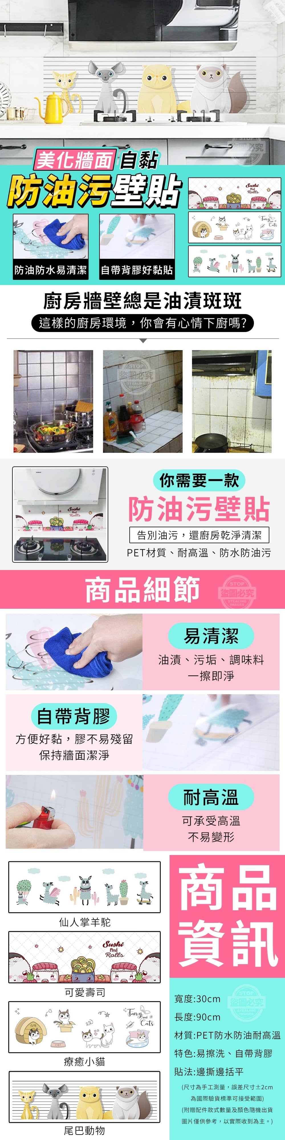 隨機不挑款【商品材質】-PET防水防油高溫【商品尺寸】-寬度30 x 長度90cm(尺寸為手工測量,誤差尺寸±2cm為國際驗貨標準可接受範圍)【商品顏色】-仙人掌羊駝、可愛壽司、療癒小貓、尾巴動物(附贈配件款式數量及顏色隨機出貨,圖片僅供參考,以實際收到為主。)【商品說明】-廚房牆壁總是油漬斑斑?這樣的廚房環境,你會有心情下廚嗎?你需要一款防油污壁貼PET材質、耐高溫、防水防油污告別油污牆面,還廚房乾淨清潔就算炒菜的時候或是使用調味料的時候不小心噴到牆面上只要擦一擦,就能擦乾淨喔!具有耐高溫特性可承受高溫不易變形而且自帶背膠方便好黏貼,膠也不易殘留保持牆面潔淨圖案清新可愛還可以美化牆面讓居家氛圍都變得不一樣了呢!