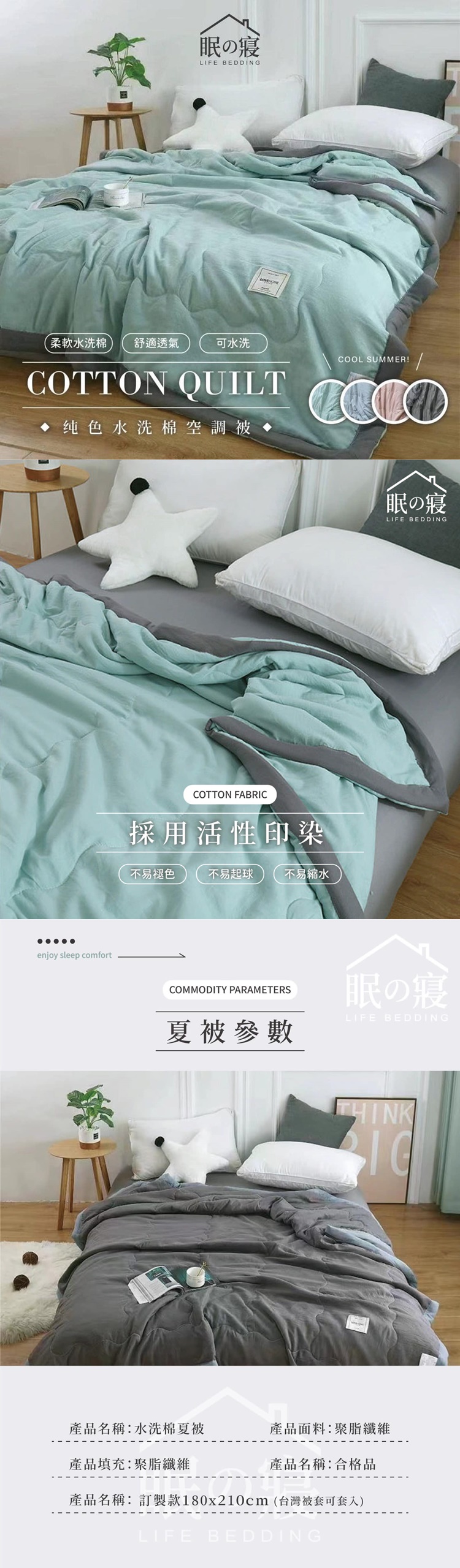 顏色:淺灰藍/古典灰/豆沙粉/松石綠 台灣尺寸訂製款 質量保證款 買過,比較過 就會知道我們的質量超高回購款率! 可以整件直接機洗! 採用活性印染,不易褪色、不易起毛球 水洗棉的面料本身就非常適合夏天這個季節 手感非常舒適親膚透氣 而且具有不易變形、不縮水的優點 讓你週末宅在家變成一種享受 被子有用絎縫定型 將棉芯牢牢固定 不怕討人厭的跑棉問題唷! 規格尺寸: 180*210cm (訂製款,台灣雙人被套可套入) 面料:水洗棉 填充:聚脂纖維