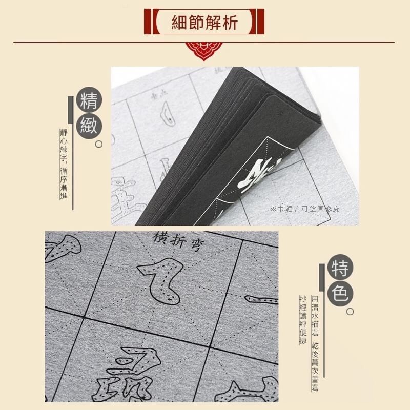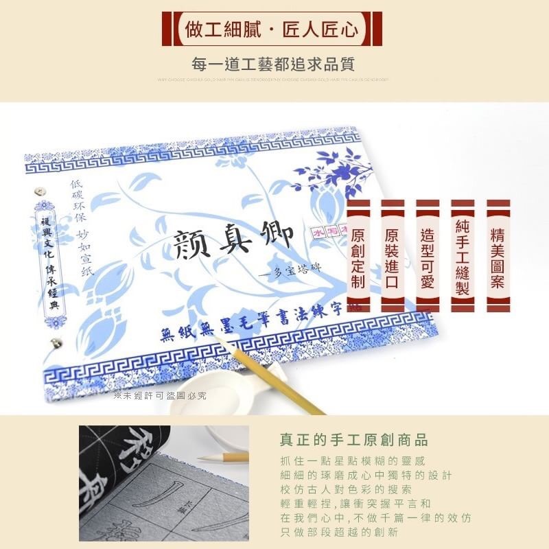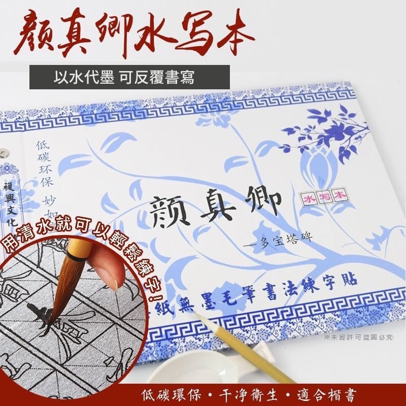 大陸直送:一箱100本5500元(免運費) 【顏真卿水寫練字】32面 顏真卿楷書水寫本適合剛開始練習書法的朋友 不用磨墨、不用準備墨汁! 不用怕墨水沾的到處都是 毛筆沾清水就可以輕鬆練字啦~ 環保不浪費紙張經濟又實惠 仿宣紙效果書寫起來十分帶感 顯色如墨汁般濃黑 從一筆一畫練起,循序漸進練就一手好書法