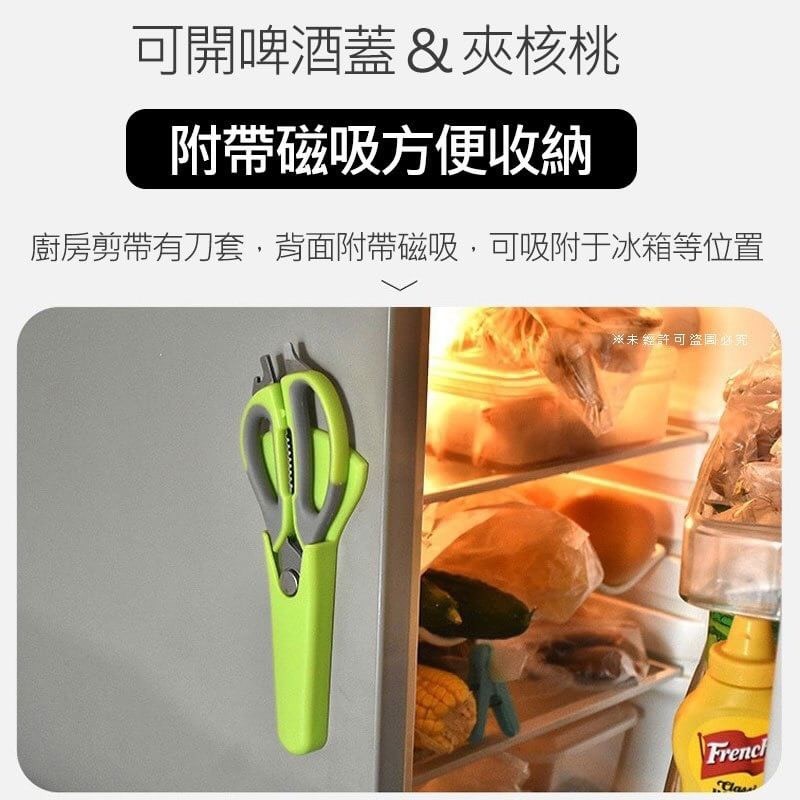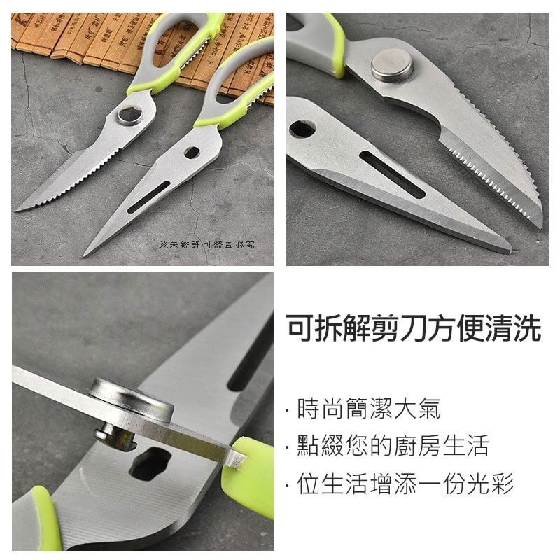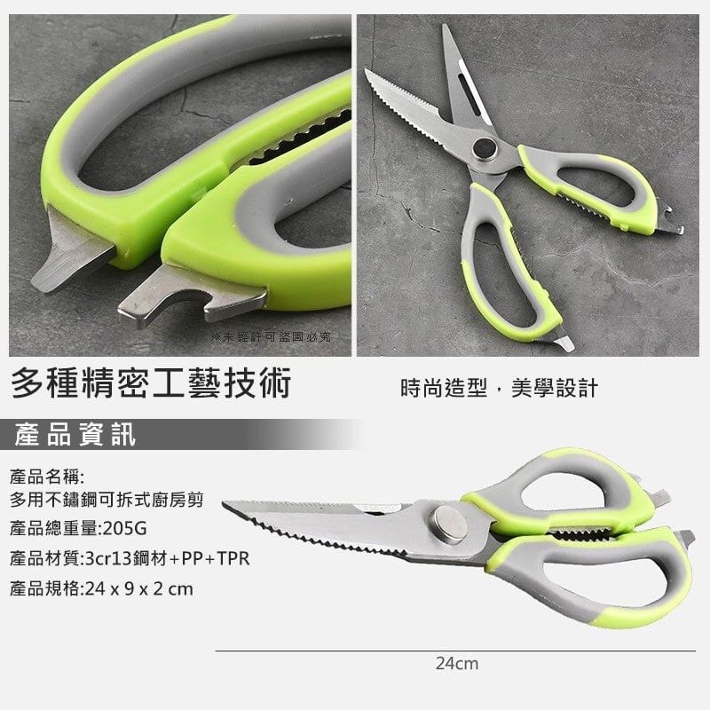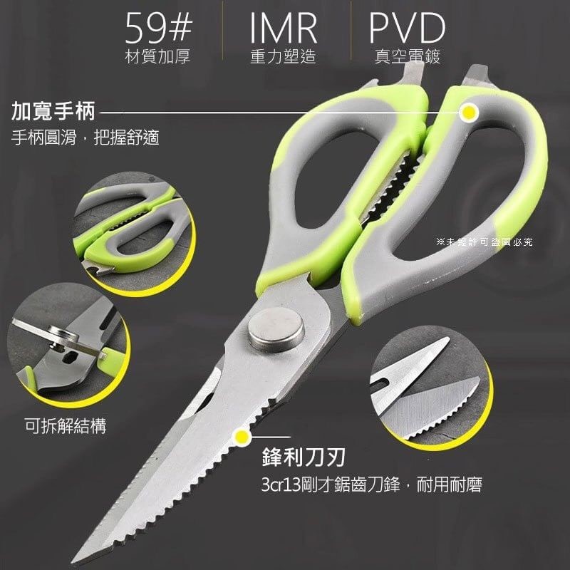 多用不鏽鋼可拆式廚房剪 台灣零批:45元 大陸直送:一箱100個4000元 時尚造型功能設計,為你的廚房來點不一樣的風格! 可拆式,使用功能多更多~ 化身刀子:鋸齒狀可拿來切麵包、 另一把鋒利小刀切肉片、切水果都可以! 開啤酒蓋、夾核桃也沒問題! 一把剪刀涵蓋多種功能! 省去買其他器材的費用~ 附帶刀套更安心,刀套背後可磁吸, 吸附於冰箱等位置收納免煩惱!!!