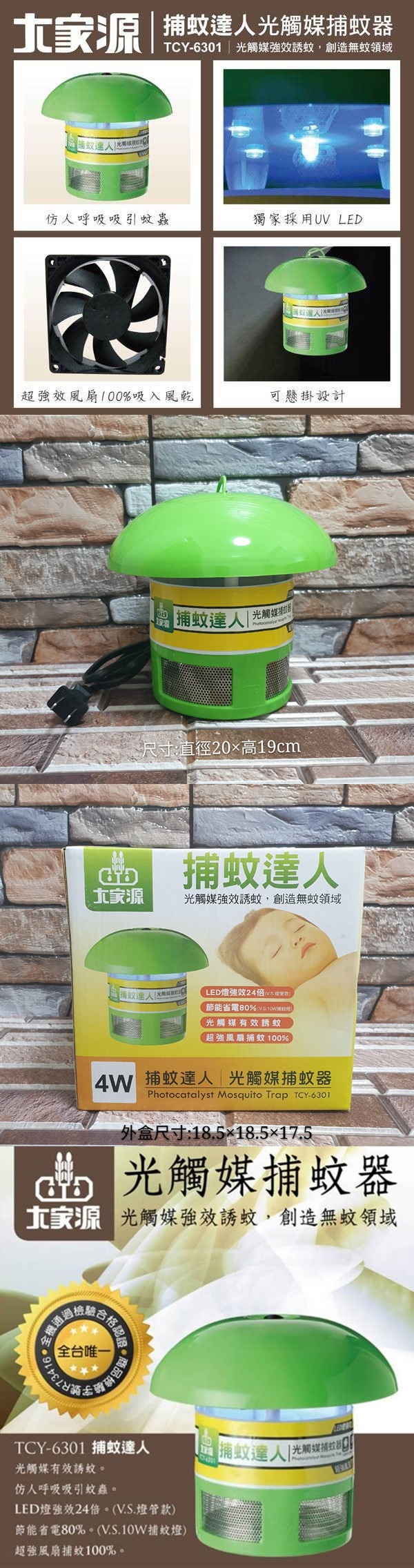 切貨:200元 、一箱12個 切貨大家源捕蚊達人 ◆超強效風扇 100%吸入風乾 ◆模擬人體呼吸及體溫誘捕蚊蟲 ◆不含有毒金屬汞,環保安全 ◆風扇吸入設計,大小蚊蟲通殺 ◆省電低耗能,使用達4萬小時 ◆安靜守護,一夜好眠。 ◆獨家採用UV LED 380nm (UVA),持續有效期達36個月 ◆LED光觸媒誘蚊系統有效、持久、安全,創造無蚊領域 ◆DC供電系統,不需變壓器,電源線通過台灣認證,安全可靠 ◆保固一年