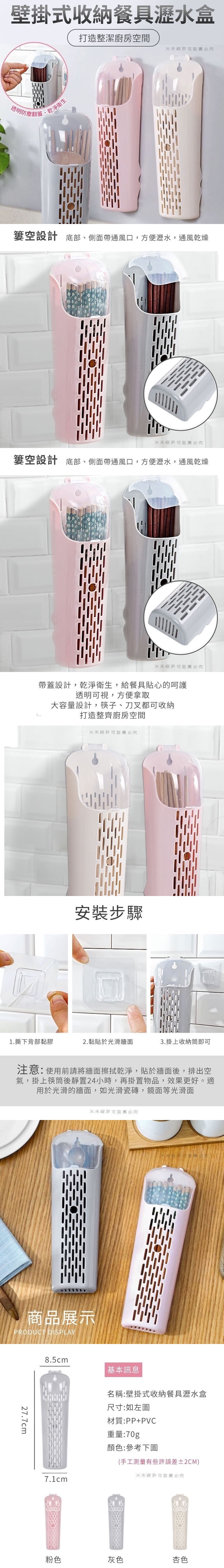 壁掛式收納餐具瀝水盒(隨機) 台灣零批:30元 大陸免運:一箱140個3500元(混裝) PP+PVC材質,帶蓋子,防塵防灰,大 容量收納,側面、底部帶通氣孔,方 便瀝水乾燥,整潔檯面,可用於收納 筷子、湯匙等,免打孔安裝,使用方 便,打造整潔廚房空間~