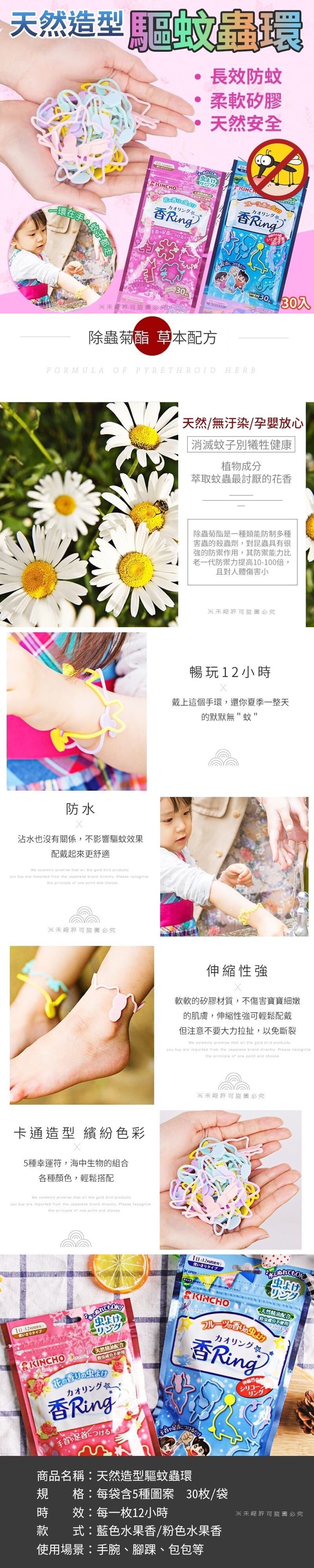 天然造型驅蚊蟲環30入 台灣零批:100元 大陸免運:一箱100包9000元(不挑色) 可愛造型的驅蚊手環很適合小朋友外出時配戴, 有長效12小時的驅蚊效果,繽紛色彩輕鬆搭配, 可以掛手腕、腳踝、包包等,防水的矽膠材質, 碰到水也沒關係,不會影響驅蚊效果, 天然植物成分,無汙染使用放心,讓你夏季一整天默默無"蚊"