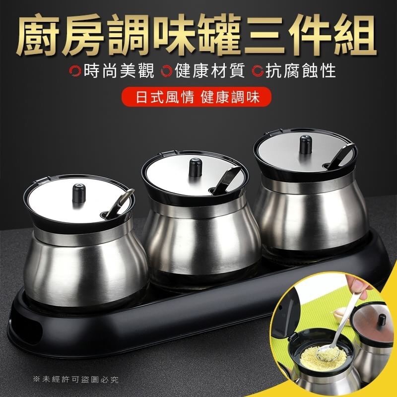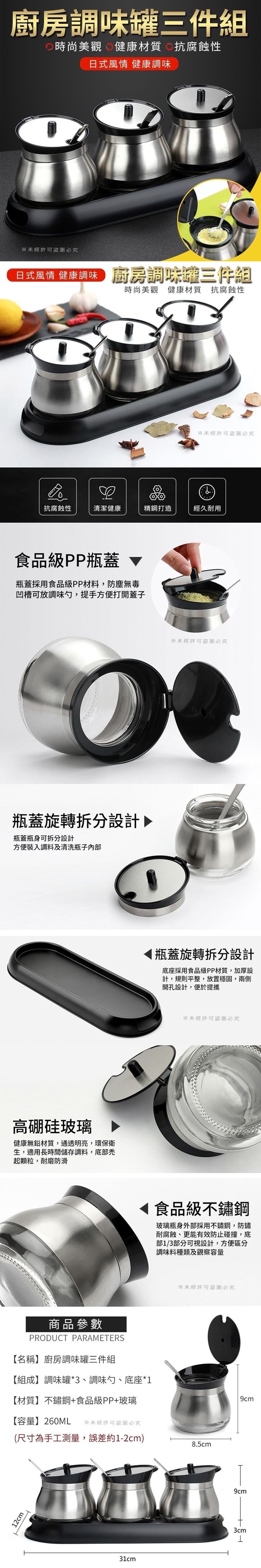 廚房調味罐三件組 台灣零批:160元 大陸免運:一箱36個5220元 食品級PP瓶蓋,防塵無毒, 凹槽可放調味勺,提手方便打開蓋子, 底部採用高硼硅玻璃,通透明亮, 方便觀察調料種類與剩餘調料, 瓶身採用不鏽鋼,防鏽耐腐蝕,堅固耐用,健康調味~