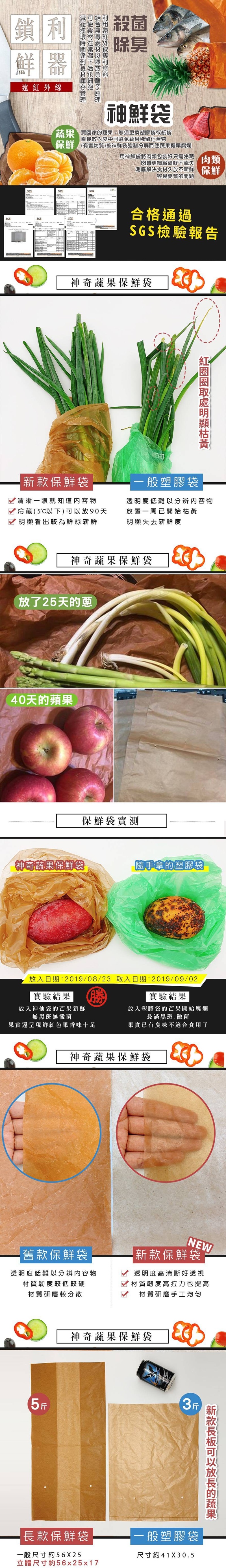 3斤袋正常版5枚 5斤袋立體版3枚 共8枚 『環保蔬果保鮮袋』 天氣熱放在冰箱的東西真的很容易壞 蔬果魚肉就是要新鮮 這個輔助的袋子一定要效果好 第二代保鮮袋特點: 材料研磨做工均勻 透視度明顯 袋子韌性拉力提高 消費者信心指數上升。 夏天就是蔬果最常容易壞掉的時候 可以水洗之後重複使用 破損洗乾淨曬乾之後放到鞋櫃或者是 冰箱裡面還可以除臭 夯爆啦!