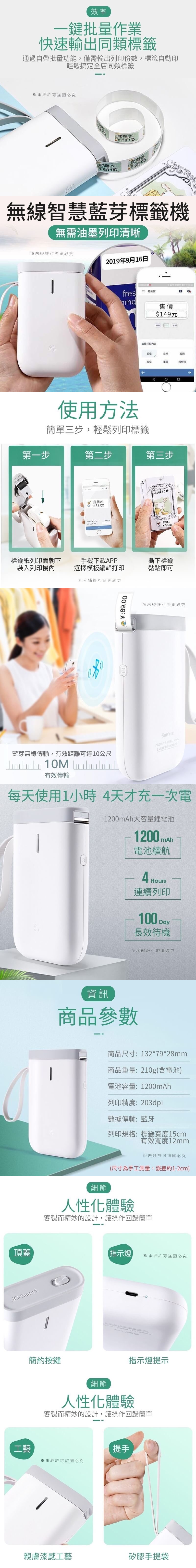 無線智慧藍芽標籤機 台灣零批:650元/台 標籤紙批:130元/捲 大陸免運:一箱50卷6000元 標籤紙尺寸:12mmx30mm(230張) 人性化體驗,無須油墨列印 清晰,藍芽無線可達10公尺 距離,一鍵批量作業,快速 輸出同類標籤,通過自帶批 量功能,僅需輸出列印份數 ,輕鬆搞定全店同類標籤~