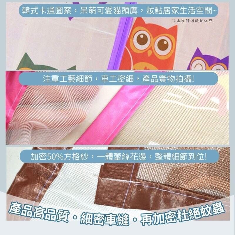 顏色:粉、紫、咖、藍 以前舊款紗窗都很醜!而且網子洞洞有大有小, 有些蚊子努力擠都擠的進來=口=" 簡直蚊帳、紗窗掛心酸的辣T.T~ 只要在門口掛上這款,加密50%方格紗, 蚊子就很難進的來! 緊密的車縫,杜絕其蟲類入侵的可能性!! 夏天到了,又可以透氣又通風~ 一體蕾絲花邊和可愛的貓頭鷹,掛在家裡也非常搭!!
