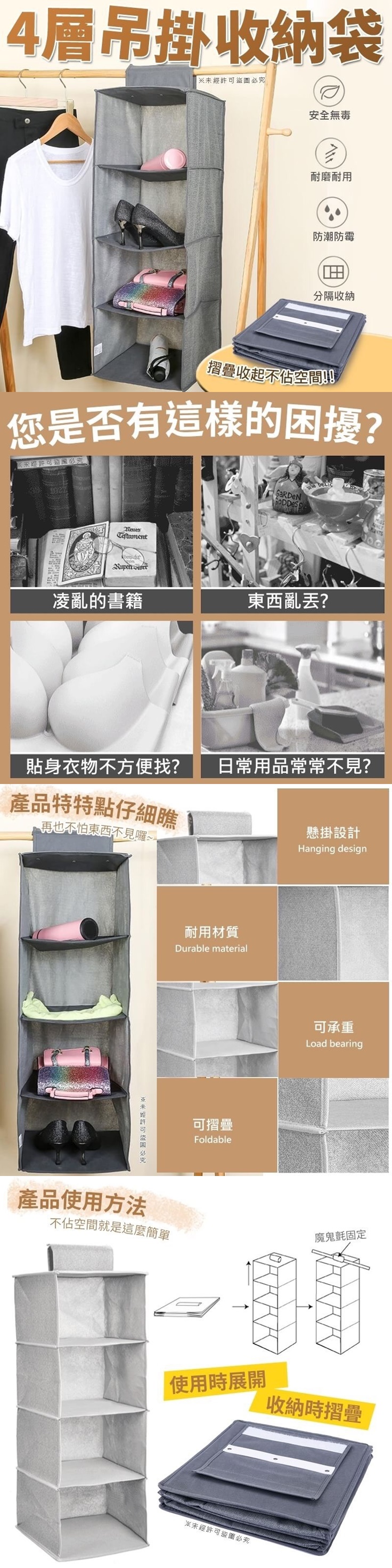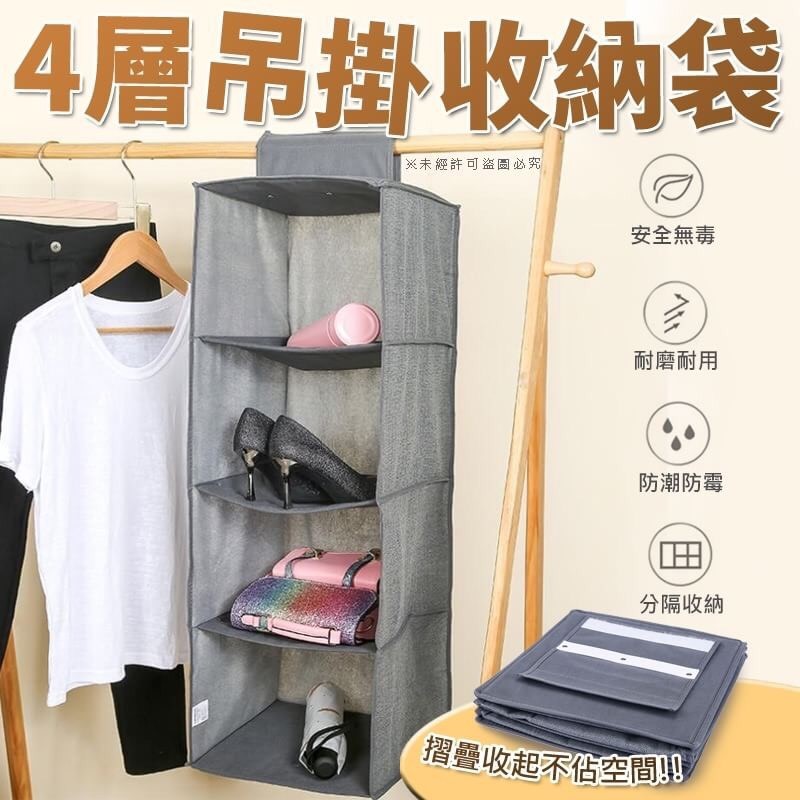 東西總是亂啊亂~ 我好煩好煩..這個也少那個也少.. 吊掛式4層收納簡單物品 再也不怕東西不見囉~ 懸掛式設計有效利用空間 耐用材質可承重!! 不用時可折疊方便好收! 怎樣都不佔位~讚讚讚!!!