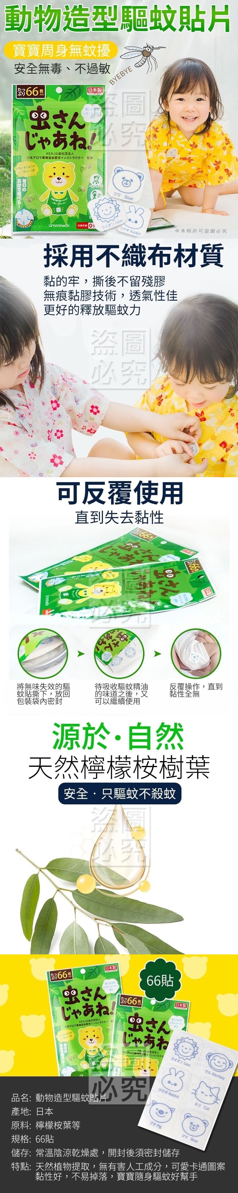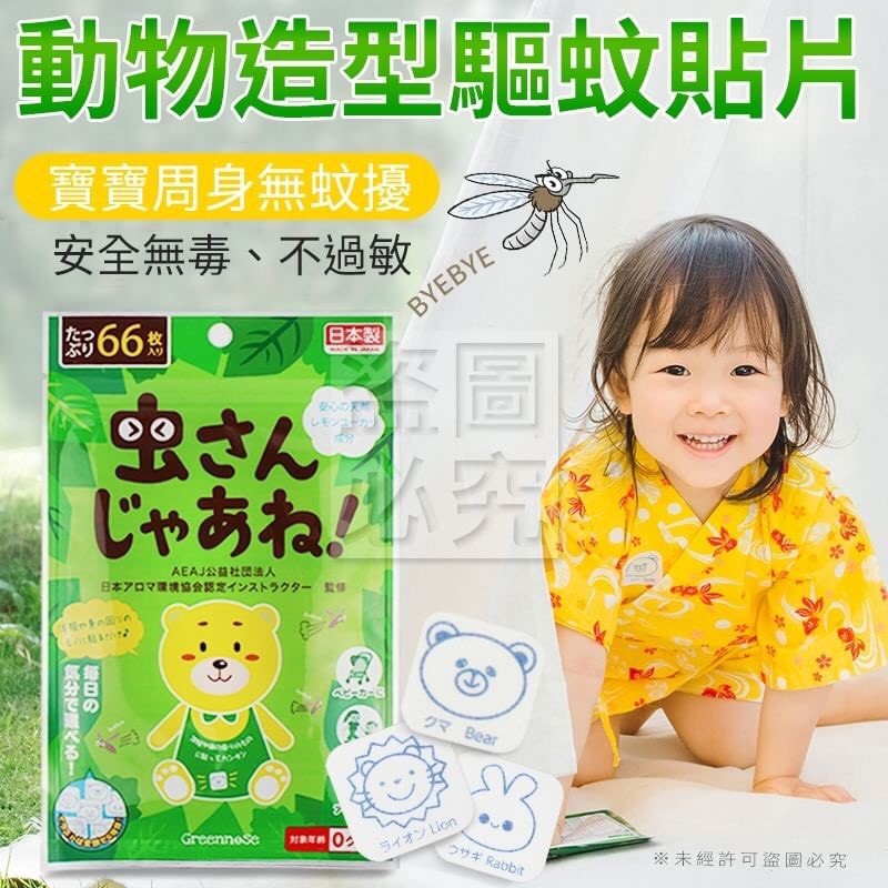 動物造型驅蚊貼片66片 批發:50元 天然植物提取,只驅蚊不殺蚊 ,無有害人工成分,可愛卡通 圖案,黏性好,不易掉落,想 貼就貼,長效驅蚊達6小時, 寶寶隨身驅蚊好幫手~