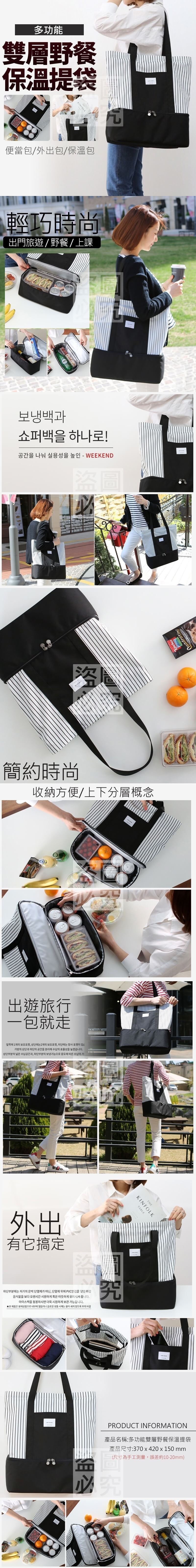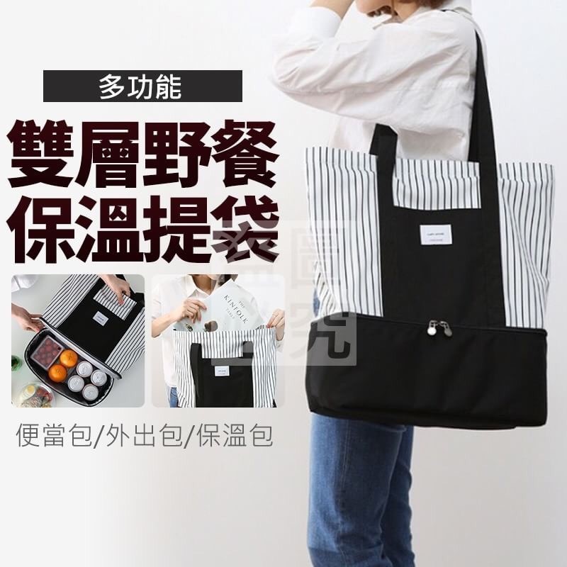 多功能雙層野餐保溫提袋 台灣零批:135元 時尚購物新選擇,韓系條紋保溫購物袋 時尚美觀 條紋外觀設計,好看又實用 大容量+保溫保冰袋 容量超大,上方空間方便直接裝取不用擔心不夠裝 下方為保溫袋,拉鍊設計完全分隔,可放生鮮食品或是飲料保冰 多用途設計 上班、上課、露營、野餐、購物都超適合,外出帶它就對了