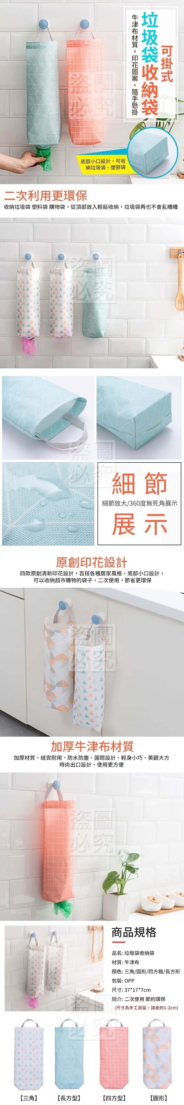 可掛式垃圾袋收納袋 台灣零批:35元 /個 一箱100個(混裝) 牛津布材質,印花圖案、隨手懸 掛四款原創清新印花設計,百搭 各種居家風格,底部小口設計, 可收納垃圾袋、塑膠袋,二次使 用,節省更環保~