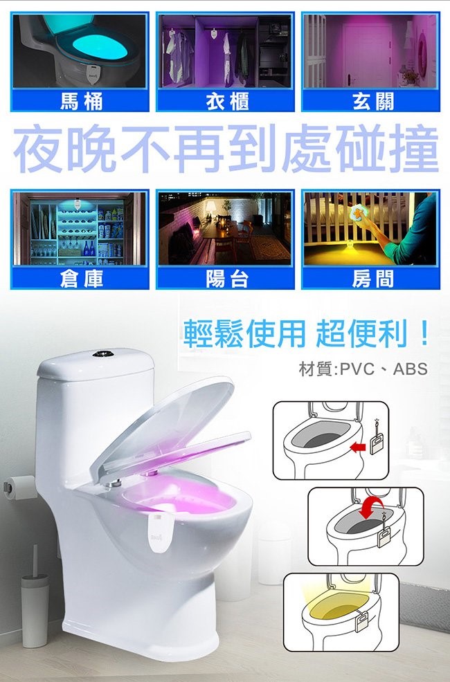 BACO德國LED七彩自動感應燈 切貨:45元、只有1200個 夜晚自動感應照明 避免開燈刺眼 不用摸黑找電源 不干擾他人睡眠 內置防水LED感應燈 可變換7種顏色 感應距離最遠可達3公尺 特殊懸掛設計 可隨意掛置照明 電源:3號電池*3 商品規格:6.8*9.5*1.8cm 商品材質:PVC+ABS