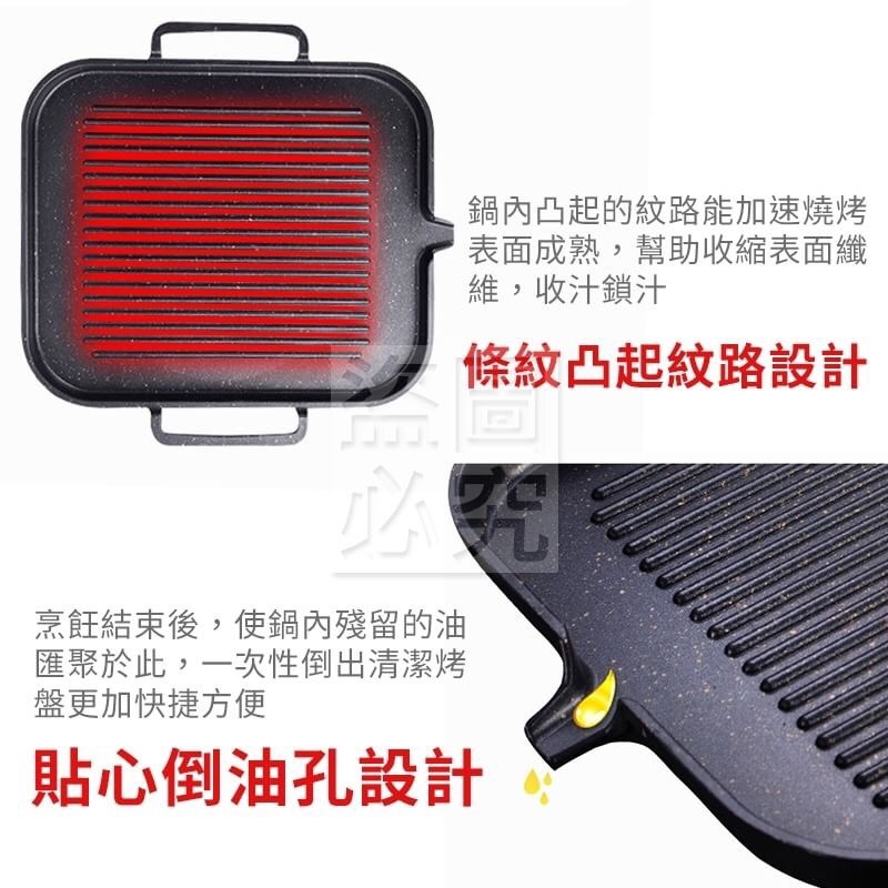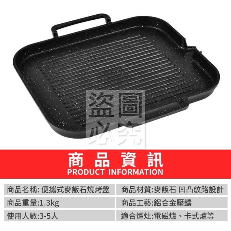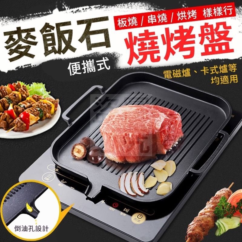 便攜式麥飯石燒烤盤 特批:260元 便攜式一體成形的壓鑄盤體 ,堅固耐用,通用各種爐具 ,加厚鋼材覆底,導熱更快 更強,無煙、不沾、漏油裝 置設計,可漏油,板燒、串 燒、烘烤樣樣行