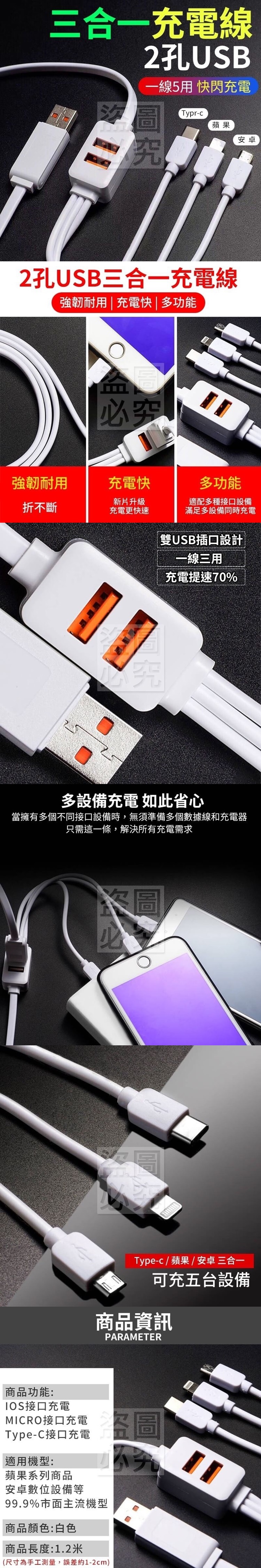 A2孔USB三合一充電線 台灣零批:50元 一箱100條 2.1a 有傳輸功能 新款設計人性化設計!三合一充電線、 大電流輸出可同時為3部手機充電,多 出的2個USB插口還可為其它的接口設備 充電,一線五用快閃充電!