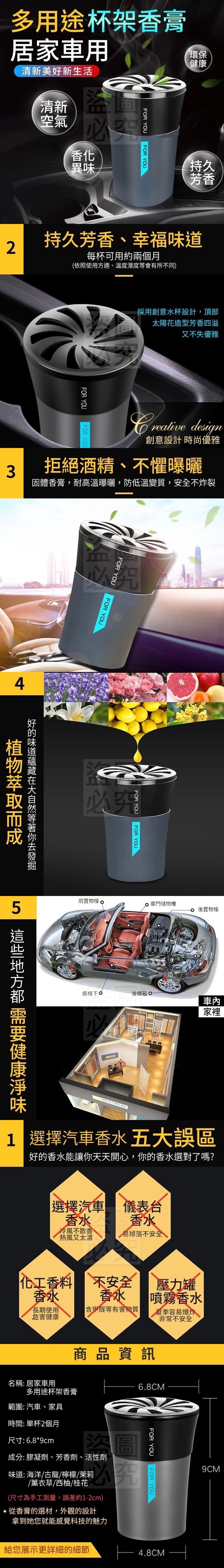 居家車用多用途杯架香膏 台灣零批:18元 固體香膏,耐高溫曝曬,安全不 易變質,天然植物萃取而成採用 創意水杯設計,頂部太陽花造型 芳香四溢,又不失優雅,天然芬 芳、給您清新美好新生活~