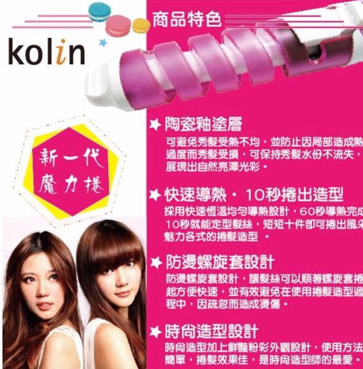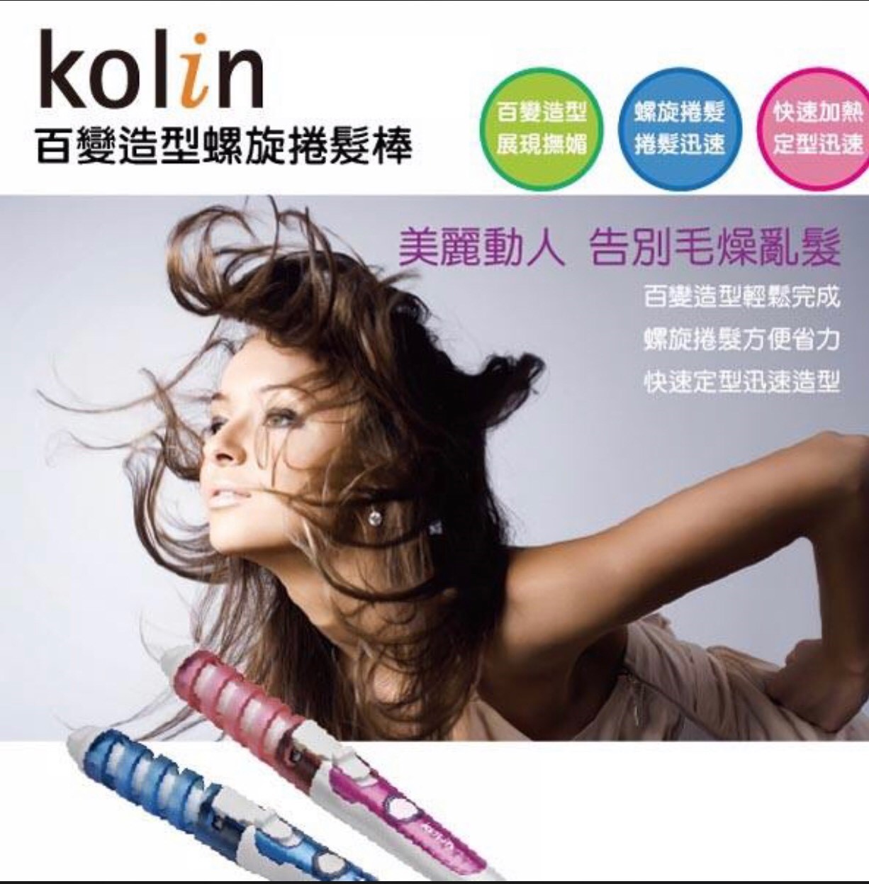 廠商出清 歌林百變螺旋捲髮棒 出清:220元 、一箱30支 ■ 採用陶瓷釉面板讓秀髮更順 ■ 新一代螺旋捲紋更方便捲髮 ■ 全機防燙傷設計使用更安心 ■ 60秒快速加熱10秒快速定型 ■ 恆溫控制保護秀髮不易受損商品尺寸長33cmx圓徑4cm圓徑