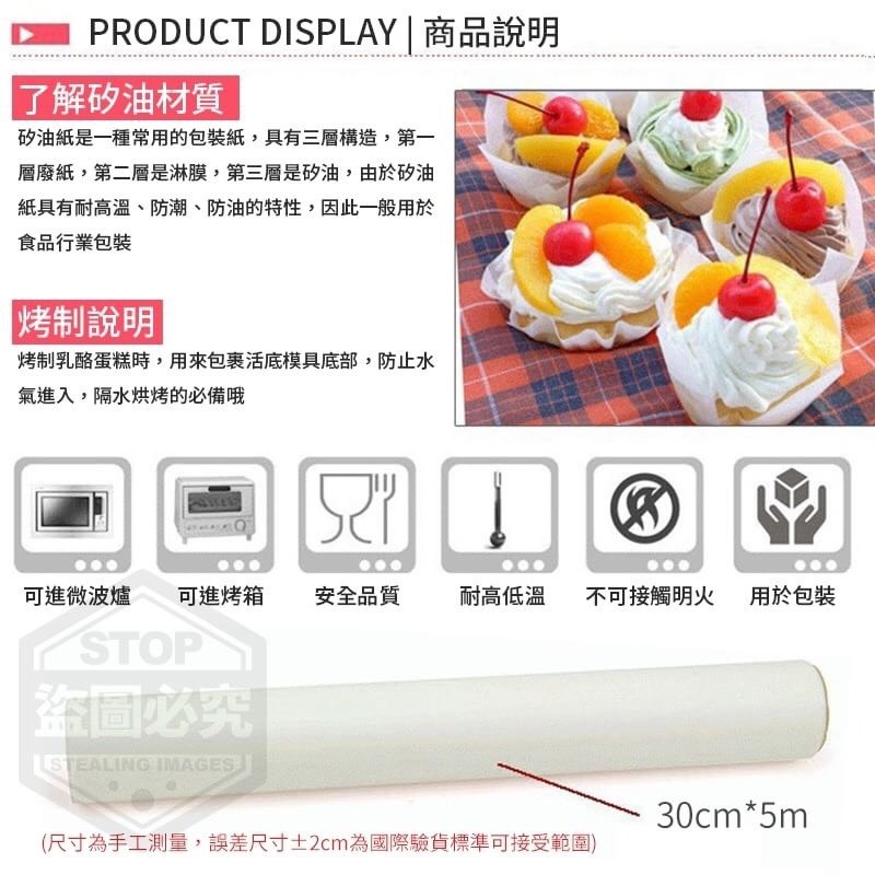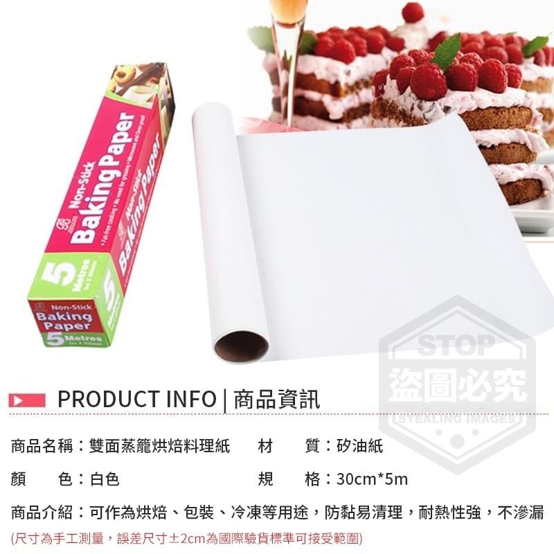 雙面蒸籠烘焙料理紙 台灣批發:20元 【商品尺寸】30cm*5m (尺寸為手工測量,誤差尺寸±2cm為國際驗貨標準可接受範圍) 【商品材質】-矽油紙 【商品說明】- 可作為烘焙、包裝、冷凍等用途,防黏易 清理,耐熱性強,不滲漏表面平滑手感好 ,不容易柔皺,不易破損,讓燒烤、烘焙 、料理成為快樂的享受,是您提升工作效 率的好幫手!