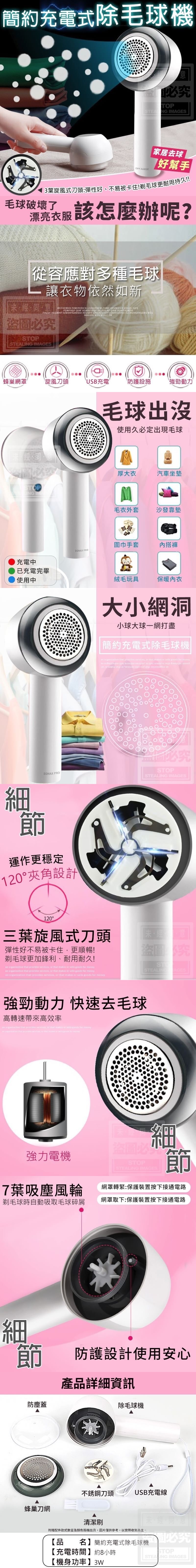 簡約充電式除毛球機 魔神零批:168元 (附贈配件款式數量及顏色隨機出貨, 圖片僅供參考,以實際收到為主。) 【商品說明】- 家居去毛球的好幫手~ 別再讓毛球破壞你的漂亮衣服~ 設置防護措施讓你用得安心 usb充電式最方便最好用拉~ ˙三葉旋風式刀頭120度夾角設計:好彈性不易被卡住! ˙強勁動力快速去毛球:高轉速帶來高效率! ˙7葉吸塵風輪:自動吸取毛球碎屑!