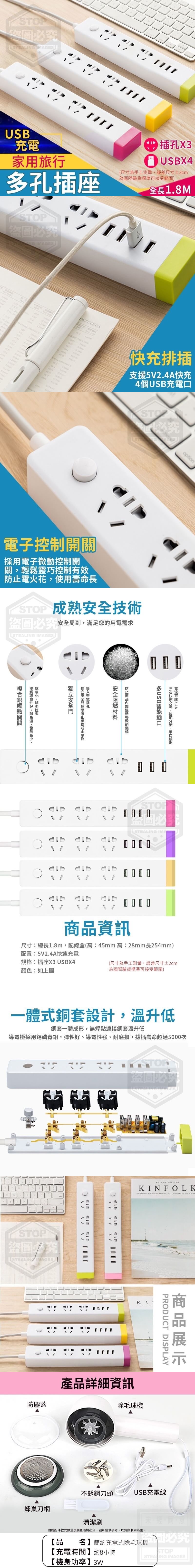 USB充電家用旅行多孔插座 台灣零批:180元 【商品尺寸】總長1.8m,配線盒(高:45mm 高:28mm長254mm) (尺寸為手工測量,誤差尺寸±20mm為國際驗貨標準可接受範圍) 【商品說明】- 支援5V2.4A快充4個USB充電口+3插孔 導電極採用錫磷青銅,彈性好、導電 性強、耐磨損,拔插壽命超過5000次 電子微動控制開關,輕鬆靈巧控制有 效防止電火花,輕鬆解決居家旅行用 電的煩惱~
