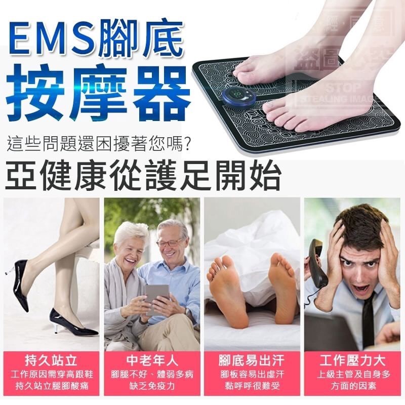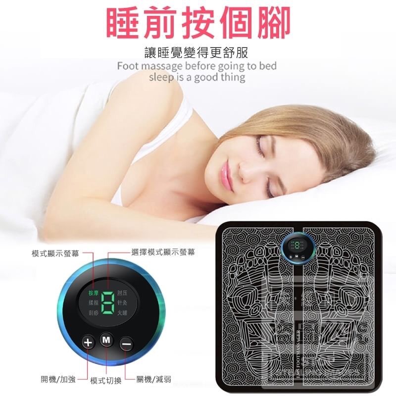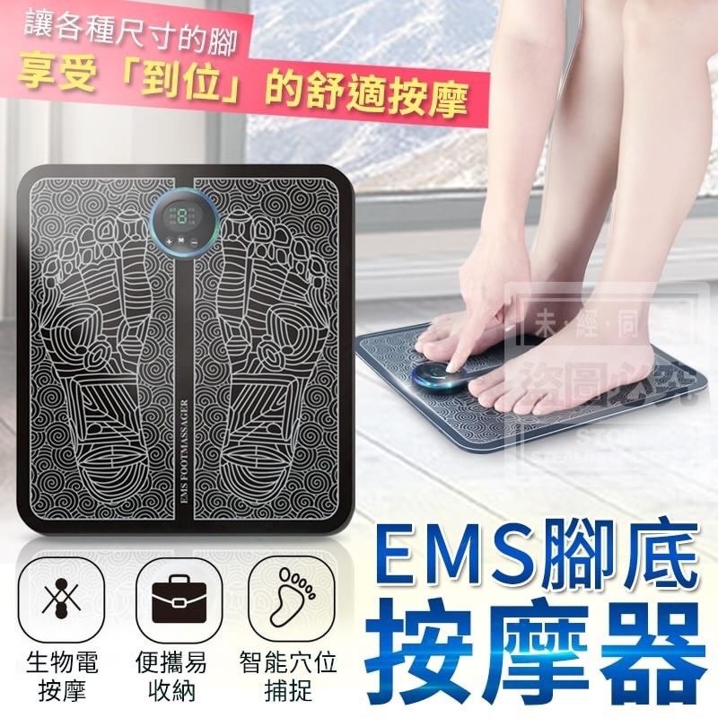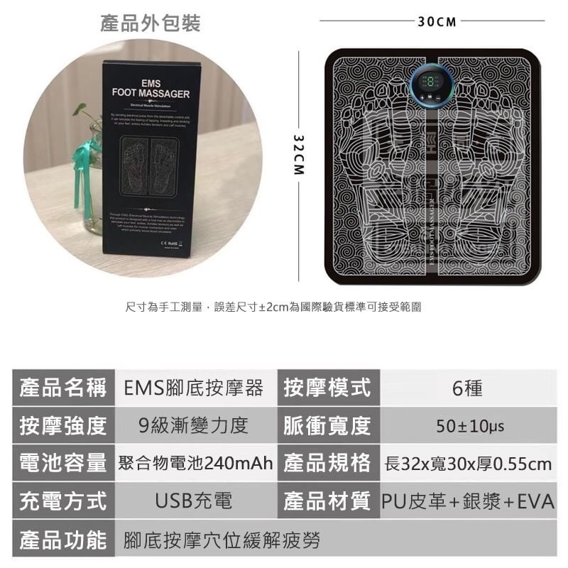 EMS腳底按摩器 批發:180元 【商品尺寸】- 32X30CM 厚度0.55CM (尺寸為手工測量,誤差尺寸±2cm為國際驗貨標準可接受範圍) (附贈配件款式數量及顏色隨機出貨,圖片僅供參考,以實際收到為主。) 【商品說明】- 亞健康從護足開始~ 腳底按摩你的腳部穴位 緩解你的日常疲勞 6種按摩模式可供選擇 9級漸變力度可調整 USB充電好攜帶